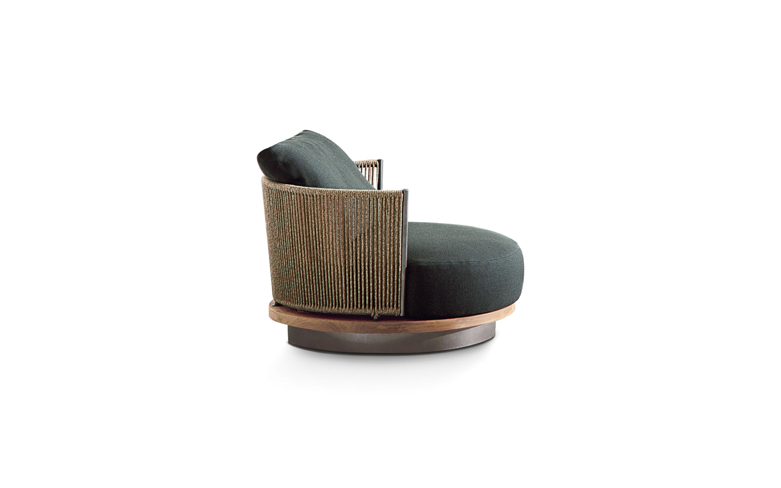 Parte del sistema de asientos para exterior Daylight, el sillón homónimo – disponible en dos tamaños diferentes o como un espacioso loveseat – combina formas circulares y proporciones elegantes. En un hábil juego de líneas, la estructura curvada de los respaldos y apoyabrazos se conforma como un abanico envolvente y dinámico, mientras que la base de teca le confiere un aspecto natural.