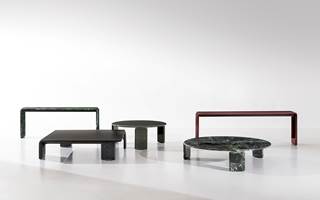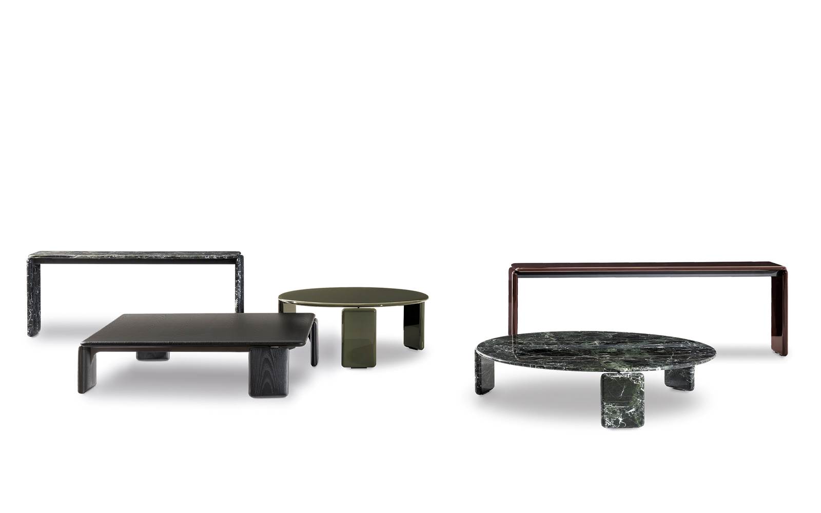 Una familia de mesas de centro y consolas de diferentes formas y tamaños, ideales para integrar en espacios de vida contemporáneos.