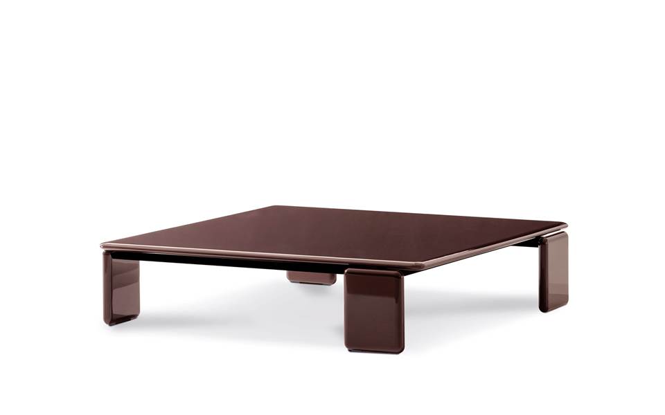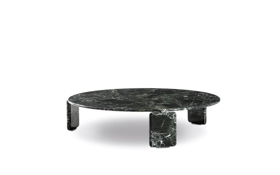 Las mesas de centro Drake se distinguen por el refinado equilibrio entre la monomaterialidad - en mármol, madera natural o lacado brillante - y la sensación de ligereza del tablero suspendido entre las patas.