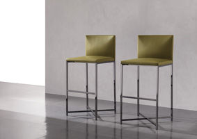 Un diseño limpio y esencial caracteriza el taburete Flynt, disponible únicamente en la versión «Cross Base» con base metálica de sección cuadrada y motivo en cruz, en acabado Black-Nickel.