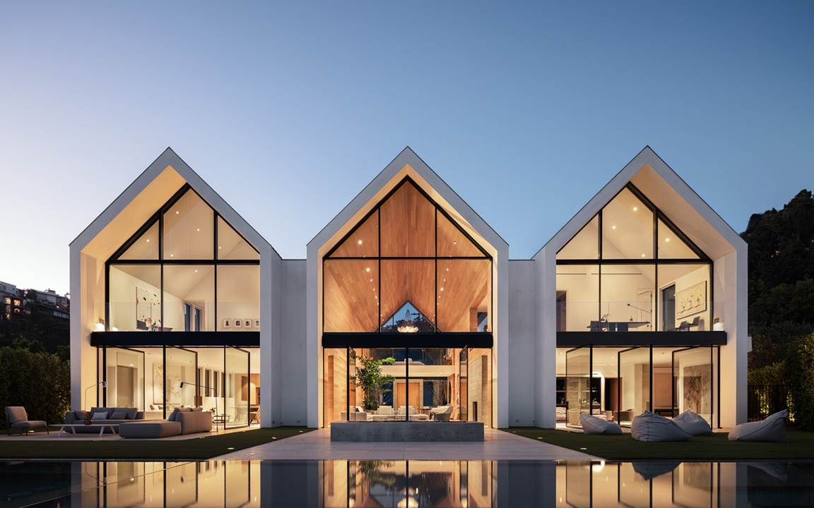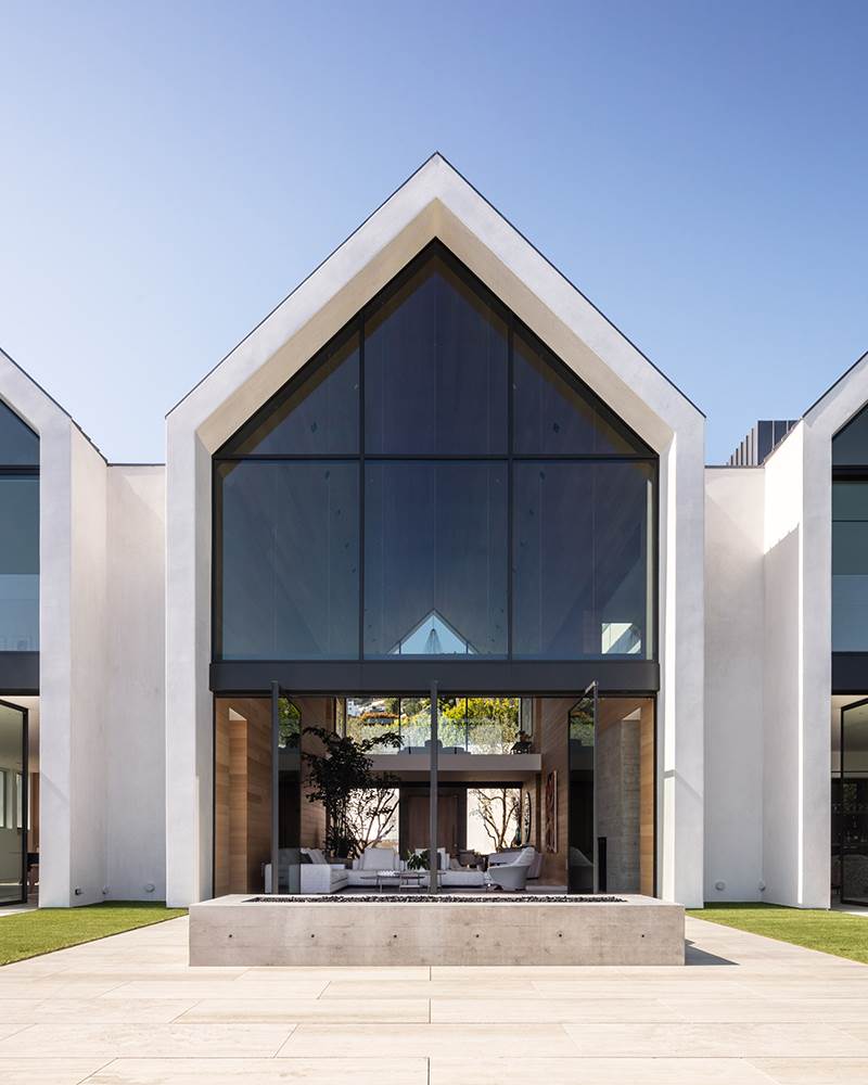 Tres inconfundibles y reconocibles tejados a dos aguas, contiguos y separados únicamente por las escaleras que distribuyen los espacios interiores, coronan los tres respectivos volúmenes domésticos, cada uno con su propia función. La planta baja, como una transición fluida entre el patio de entrada y el jardín privado donde se encuentra la piscina trapezoidal, es la planta del encuentro y la hospitalidad. La vista se abre a una sucesión de zonas de estar en las que los límites entre el interior y el exterior se difuminan gracias a las paredes de cristal, lo que permite que la arquitectura establezca un diálogo directo y armonioso con la naturaleza que la rodea; una armonía que también es posible gracias al uso de materiales y colores: el suelo de travertino que se extiende desde los interiores hasta el jardín, el cemento al natural con las marcas del encofrado y los tonos crema, blancos y grises elegidos para el mobiliario.