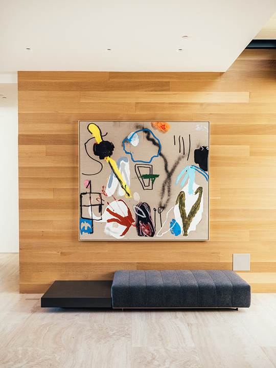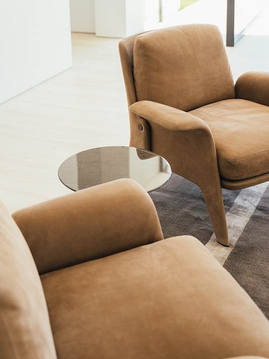El mobiliario de Minotti salpica la mayor parte de los espacios: a la entrada del cuerpo central está el banco Freeman “Tailor” y, hacia la piscina, la zona de estar principal contiene el sistema de asientos Lawrence de Rodolfo Dordoni como protagonista absoluto, acompañado del sillón Angie de GamFratesi. Cada rincón del espacio doméstico invita a disfrutar de las vistas mientras se saborea la belleza del paisaje, enmarcado por las fachadas de cristal del edificio. Para ello se han diseñado varios pequeños salones, como el de la planta superior del volumen central, que alberga los sillones Portofino de Rodolfo Dordoni.