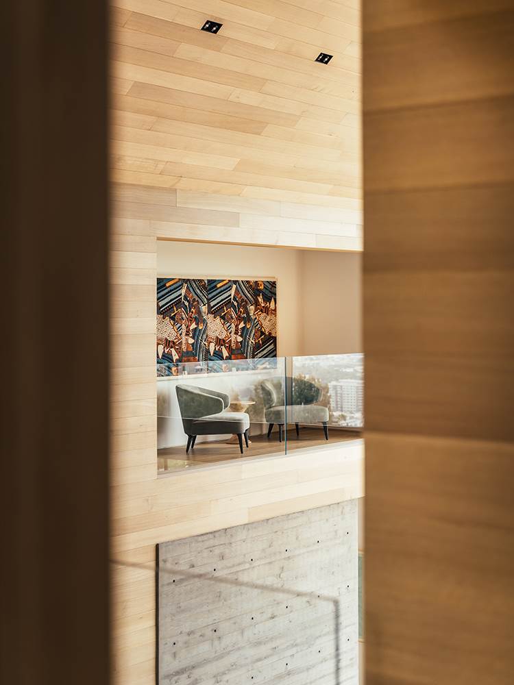 El volumen central, el único a doble altura, está enteramente revestido de madera en tonos dorados, lo que aumenta la sensación de calidez doméstica inundada de luz; los dos volúmenes laterales contienen las zonas más privadas de las plantas superiores: dormitorios, baños y el estudio.