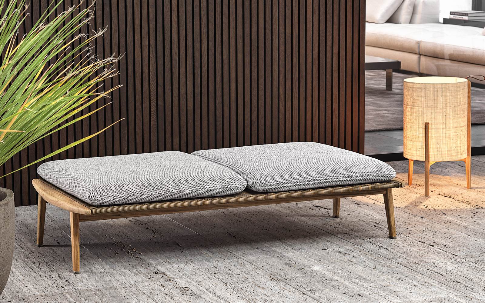 La familia se completa con un banco provisto del mismo bastidor con trama de cuerdas de efecto mimbre en color Fango, sobre el que apoyan los cojines.