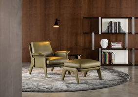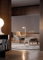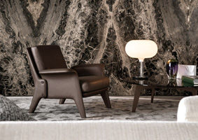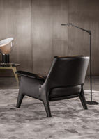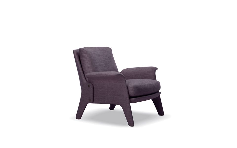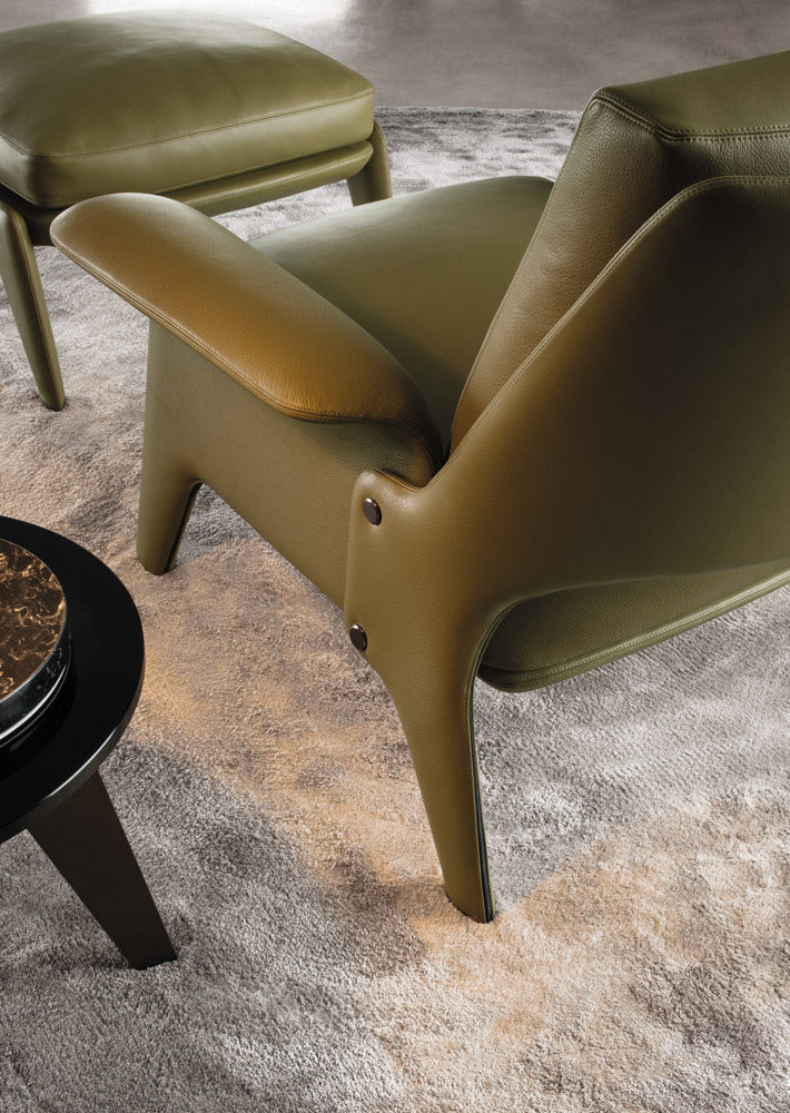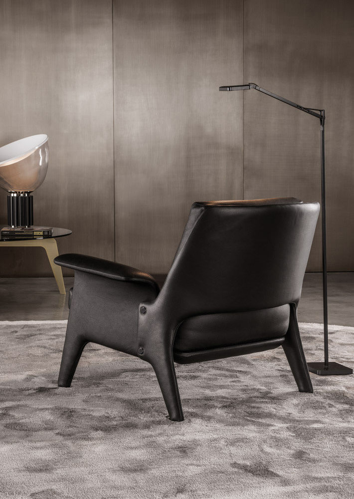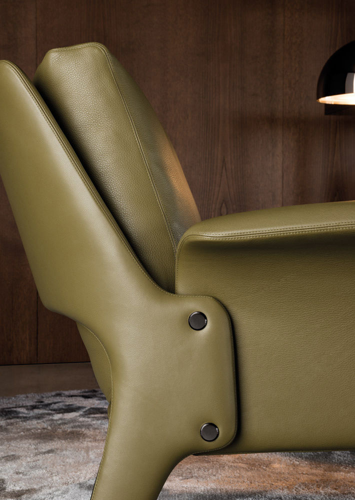Una línea fluida generada por un trazo suave y continuo: el diseño del sillón Glover nace con la idea de realizar un asiento elegante y acogedor. Sus costados se caracterizan por la especial conjunción entre el respaldo envolvente y el brazo, resaltada con elegantes tachones de metal barnizado color Peltre. En el lado trasero la interrupción del respaldo deja entrever el cojín del asiento, confiriendo un toque de ligereza al aspecto visual del sillón.