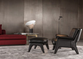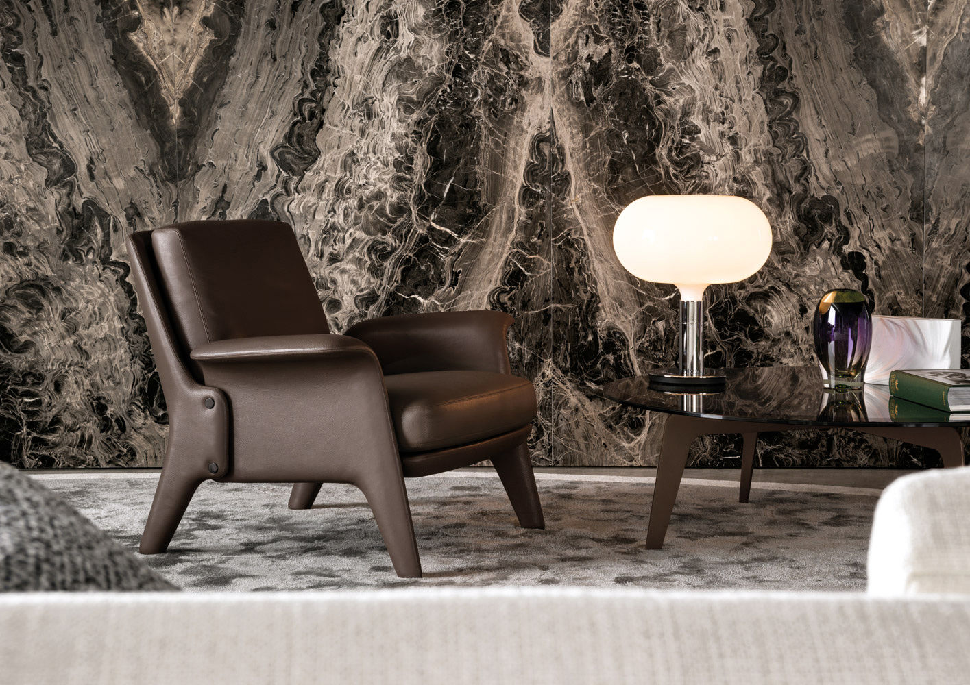 La selección de un único material de revestimiento —piel o tejido— ofrece una armoniosa sensación de monocromaticidad, mientras que sus impecables costuras revelan la alta precisión de su manufactura. El diseño de las patas también ha servido de inspiración para las mesitas Kirk que, disponibles en múltiples medidas y acabados, constituyen un complemento perfecto para el sillón Glover.