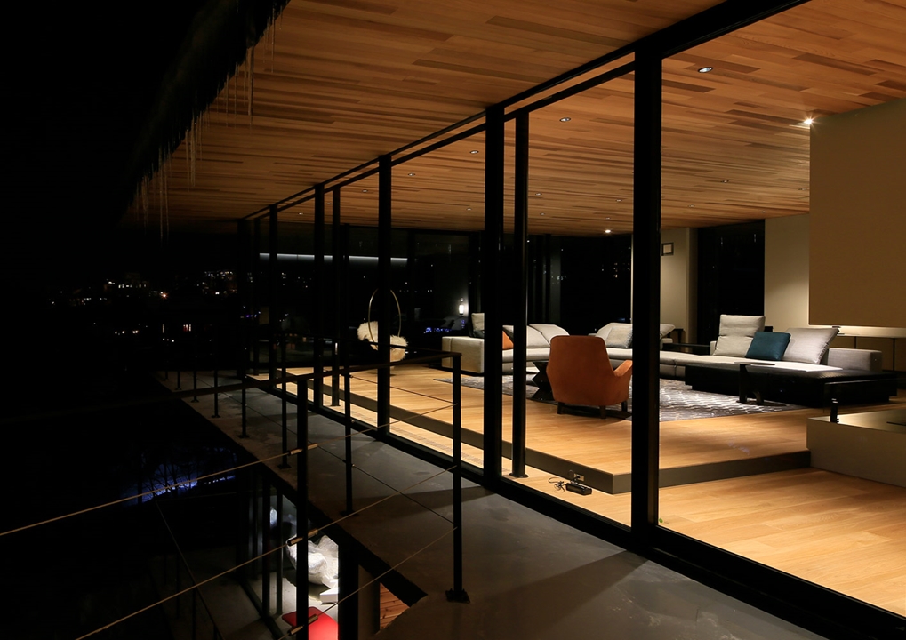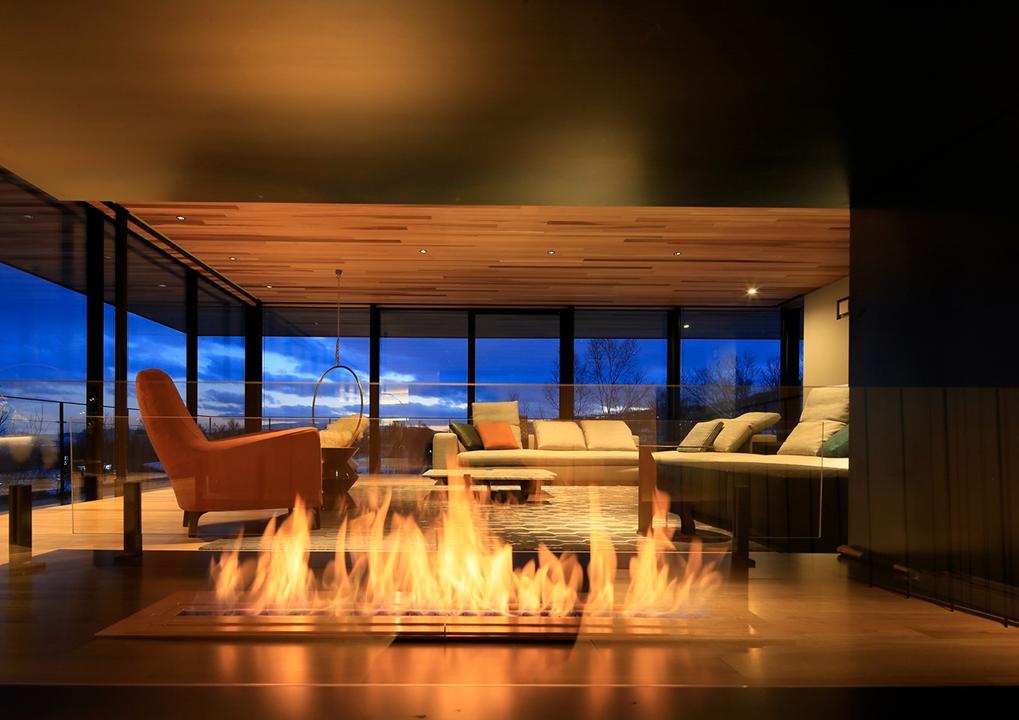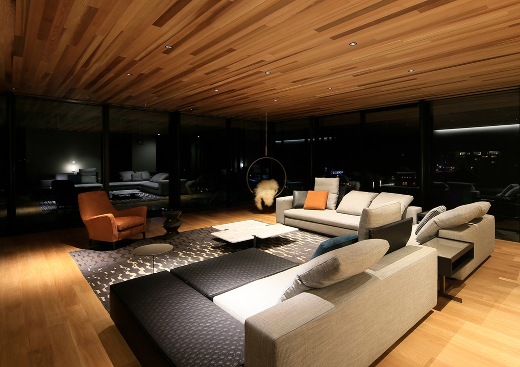 El proyecto arquitectónico de esta mansión se integra armoniosamente en el entorno paisajístico. Para amueblar la sala de estar se ha elegido una composición esquinera del sistema de asientos Yang, combinada con un sillón Denny y con las mesitas Jacob, Close y Cesar; la barra de la cocina está rodeada de taburetes Aston que acentúan su carácter social.