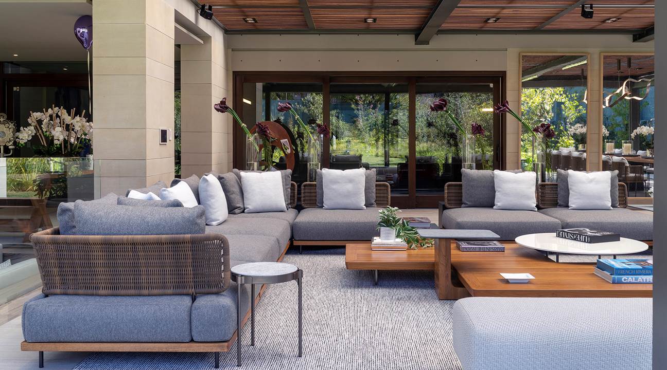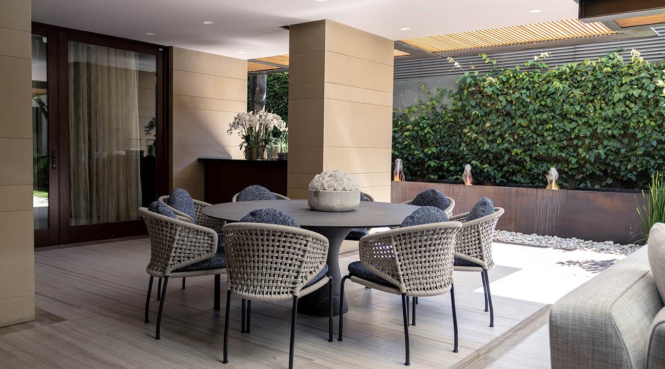 El porche es una zona acogedora y tranquila que acoge el sistema de asientos Florida, con su icónica forma orgánica, acompañado de los sillones Halley Outdoor. A su lado, un comedor privado con una mesa redonda, donde los colores neutros se entremezclan con toques de azul dados por el suave tapizado de las sillas de comedor Aston Cord Outdoor, todas ellas diseñadas por Rodolfo Dordoni.