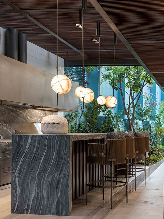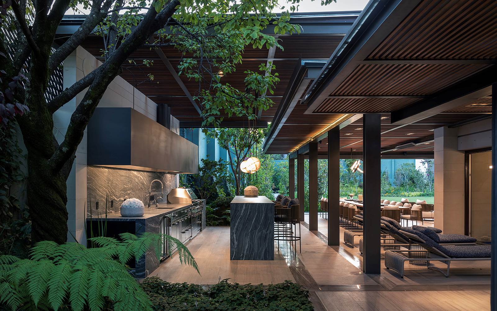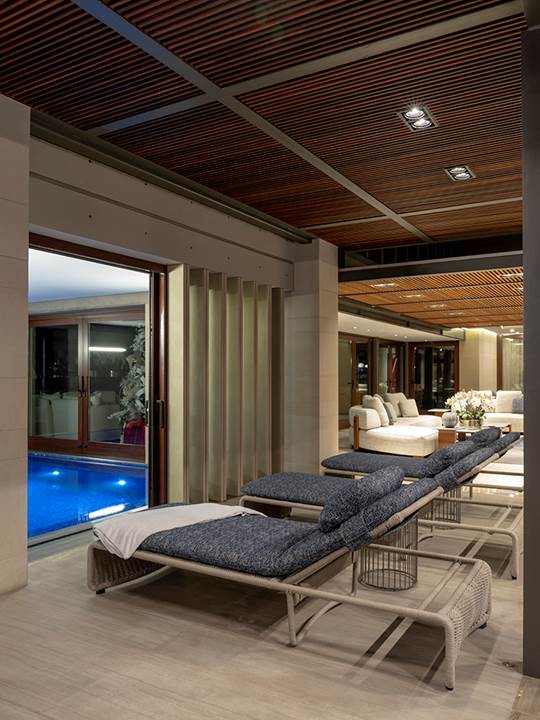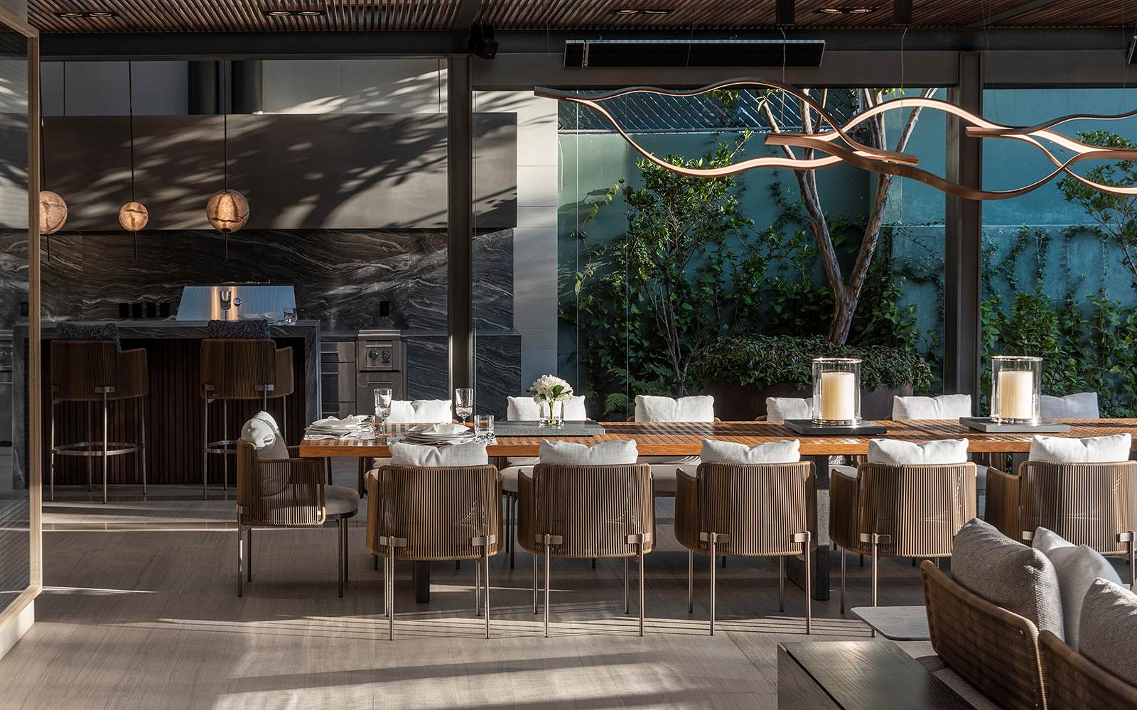 Desde el confort más íntimo hasta el que se experimenta y comparte con los huéspedes, el espacio que rodea la villa continúa a través de una sala de relajación, con vistas a la piscina cubierta y amueblada con las tumbonas Halley Outdoor, hasta llegar a la zona que alberga una cocina exterior. Aquí, la barra de cocina está acompañada por taburetes Tape Cord Outdoor de Nendo, que, junto con las mesas Quadrado de Marcio Kogan / Studio MK27 y las sillas de comedor Tape Cord Outdoor, crean una acogedora zona de comedor. El sistema de asientos modulares Quadrado complementa armoniosamente el espacio, creando una isla de gran confort con vistas directas al verdor del césped.