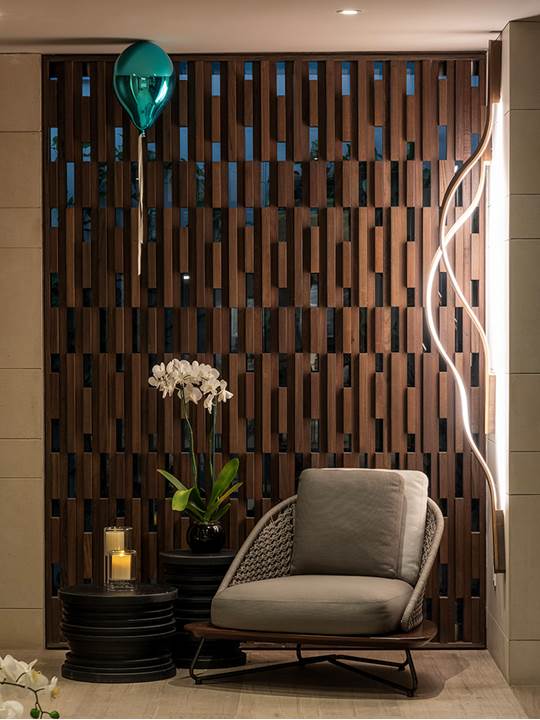 Dedicado, en cambio, a quienes desean reservarse un momento aislado de meditación, encontramos el rincón caldeado por la pared de madera perforada, que hace de filtro entre el exterior y el interior, y amueblado con el sillón Rivera de Rodolfo Dordoni, interpretación contemporánea de la elegancia retro.