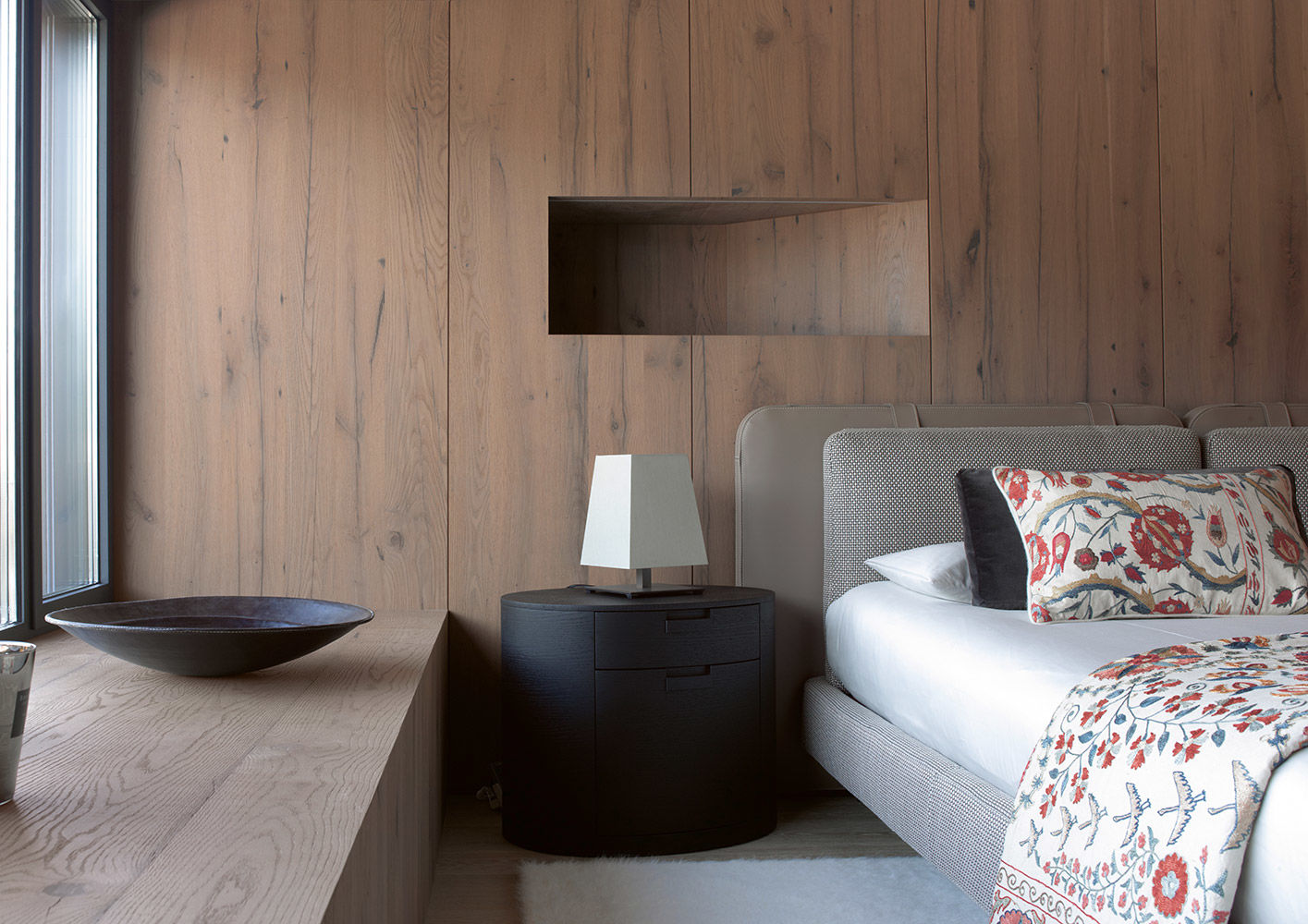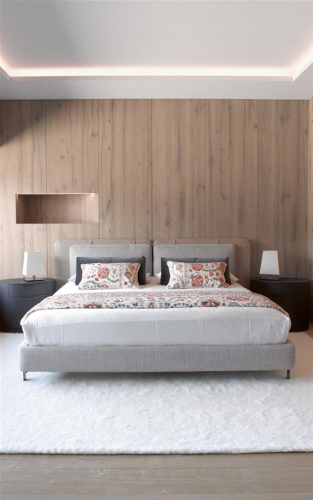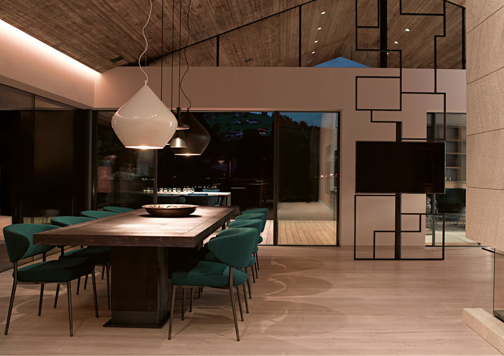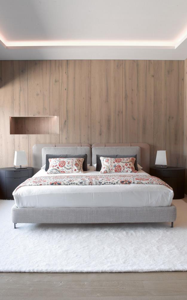 En el centro de Kaprun, una de las principales localidades turísticas de Austria, con una magnífica vista al monte Kitzhorn y perfectamente insertado en el paisaje circunstante. Son las características de un chalé unifamiliar; el proyecto de diseño de interiores fue realizado por Bernd Gruber, que dio prioridad al empleo de materiales naturales, como la piedra, unida a la madera de la boiserie y los pavimentos. Un estilo alpino perfectamente insertado en el contexto paisajístico pero de sabor absolutamente contemporáneo, que ha dictado también la elección de los muebles, muchos de ellos de la colección Minotti. El área adyacente a la chimenea se ha amueblado con una amplia y confortable composición realizada con el sistema de asientos Hamilton, revestida en tejido color gris. Las sillas que rodean la mesa de comedor son el modelo Mills, mientras que para el dormitorio se ha elegido la cama Tatlin-Soft.
