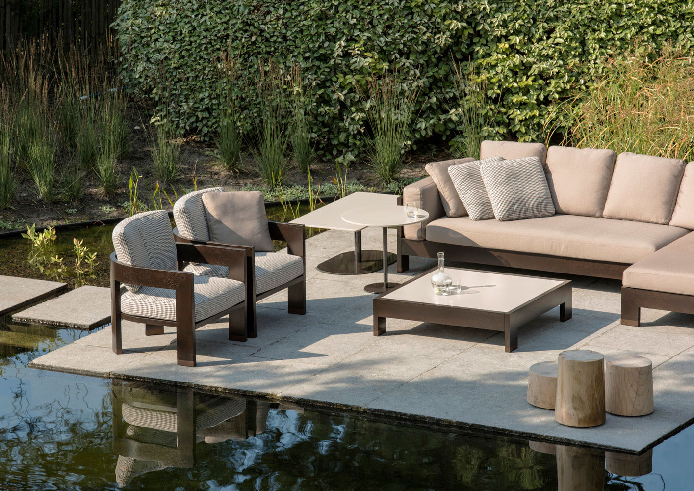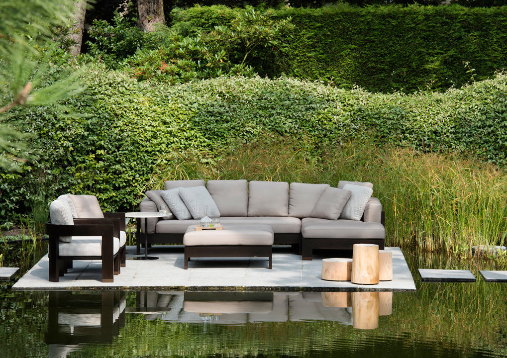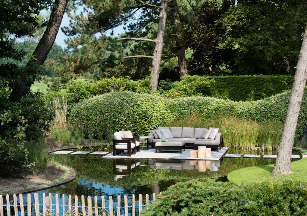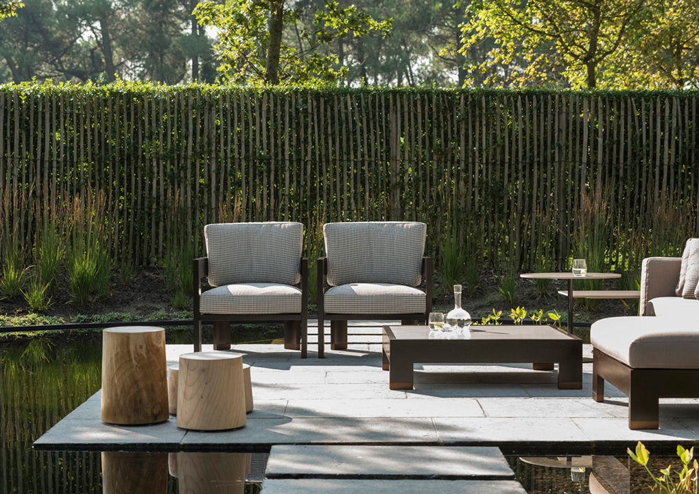 Knokke es una conocida estación balnearia del Mar del Norte, meta predilecta del turismo belga, que la ha elegido como lugar de veraneo donde construir sus casas de vacaciones. En el jardín que rodea un chalé de arquitectura tradicional se ha realizado una escenográfica plataforma suspendida sobre un espejo de agua, amueblada con el sofá Alison «Dark Brown» Outdoor, sillones Warhol «Dark Brown» Outdoor, mesitas Alison «Dark Brown» Outdoor y Bellagio, ambas con tableros de Corian. Este refinado proyecto de diseño de exteriores ha sido realizado por ‘t Huis van Oordeghem, que ha elegido el nuevo acabado «Dark Brown» y un sofisticado tejido con fantasía pied-de-poule de la colección textil outdoor, que responde a los requisitos específicos para la colocación en exteriores.