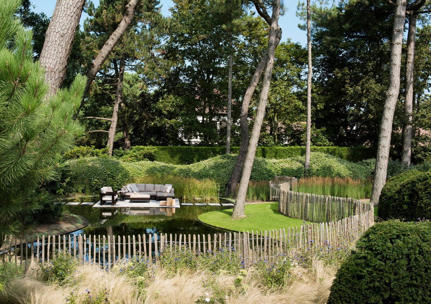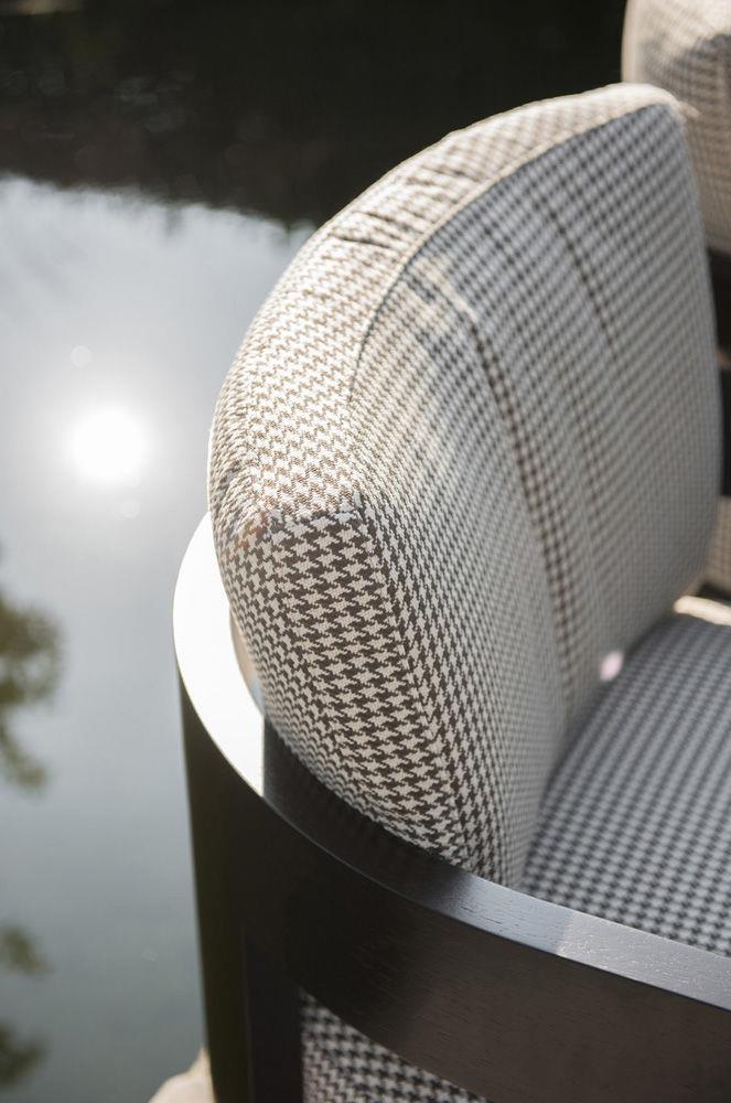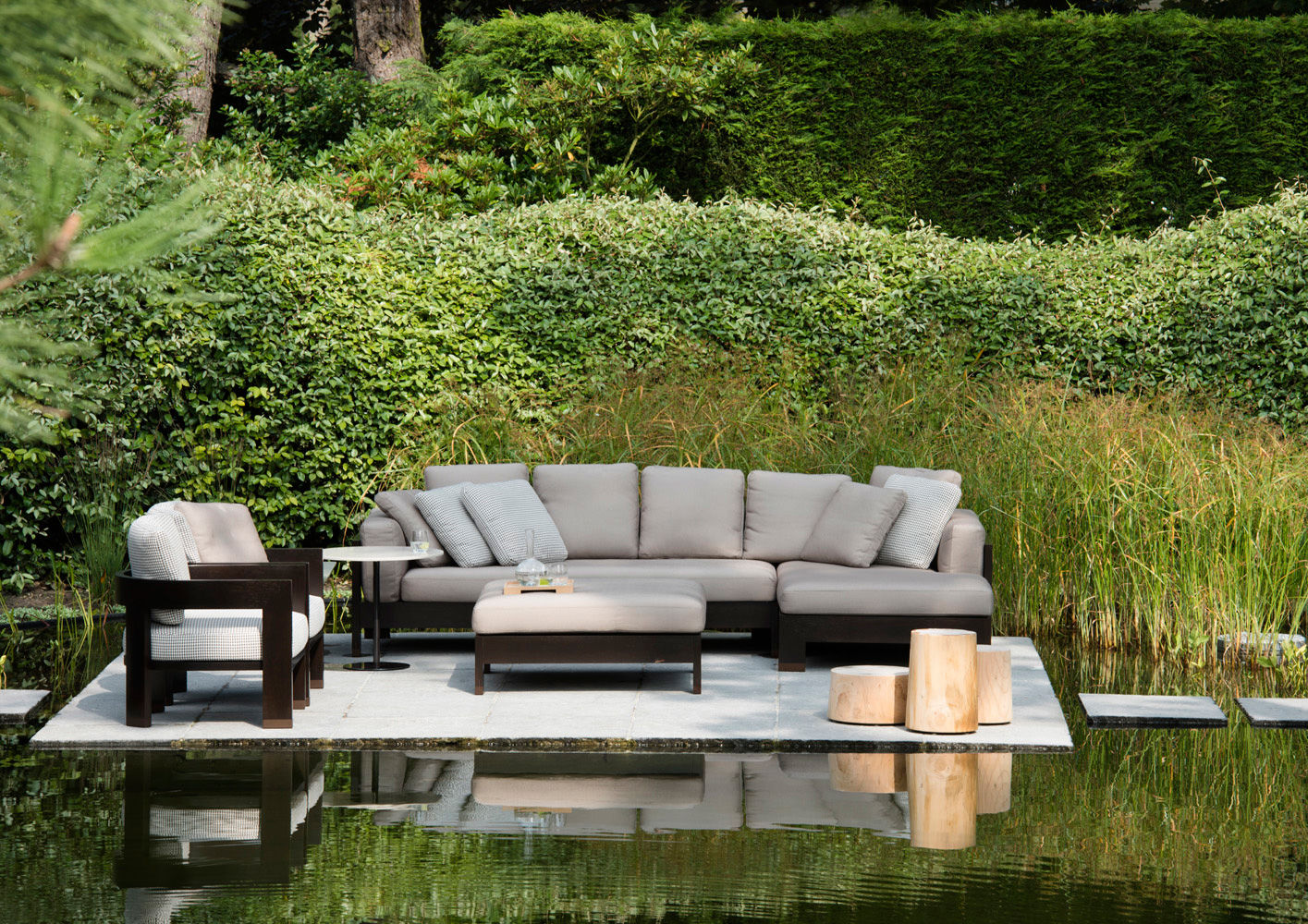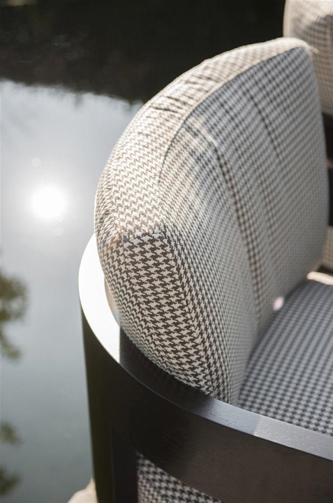 Knokke es una conocida estación balnearia del Mar del Norte, meta predilecta del turismo belga, que la ha elegido como lugar de veraneo donde construir sus casas de vacaciones. En el jardín que rodea un chalé de arquitectura tradicional se ha realizado una escenográfica plataforma suspendida sobre un espejo de agua, amueblada con el sofá Alison «Dark Brown» Outdoor, sillones Warhol «Dark Brown» Outdoor, mesitas Alison «Dark Brown» Outdoor y Bellagio, ambas con tableros de Corian. Este refinado proyecto de diseño de exteriores ha sido realizado por ‘t Huis van Oordeghem, que ha elegido el nuevo acabado «Dark Brown» y un sofisticado tejido con fantasía pied-de-poule de la colección textil outdoor, que responde a los requisitos específicos para la colocación en exteriores.