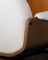 Shell made of curved plywood, with subsequent finishing process crafted on CNC machines. Padded backrest with metal insert coated in fire-resistant polyurethane foam and seat in variable-density polyurethane foam. Backrest and seat encased in breathable heat-bonded fibre laminated to white hypoallergenic cotton fabric for added softness. Non-slip fabric applied to the back of the seat cushion upholstery ensures its adherence to the structure. Armrests made with bent aluminium sheet coated in integral skin polyurethane foam, then encased in breathable heat-bonded fibre laminated to white hypoallergenic cotton fabric for added softness. Rear band, crafted with the same technique used to clad the base of the Connery seating system, with double polyurethane foam insert to ensure greater softness. Band clad to match the fabric or leather specified for the backrest when the armchair shell is made of wood. When the shell upholstery is in leather, the band will always be crafted in the same leather and colour as the shell - Aspen, Big Sur or Carmel (Nature Leather category) leather; the cushions can be upholstered in leather of a different type than the shell upholstery. The rear band is not present on the DINING little armchair. A decorative metal screw in the same finish as the base is located on the shell, near the backrest. Tailoring of the slipcover features soft top-stitching.
