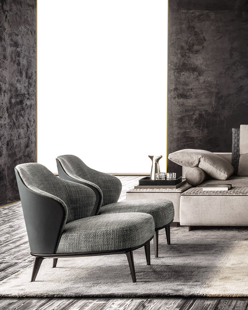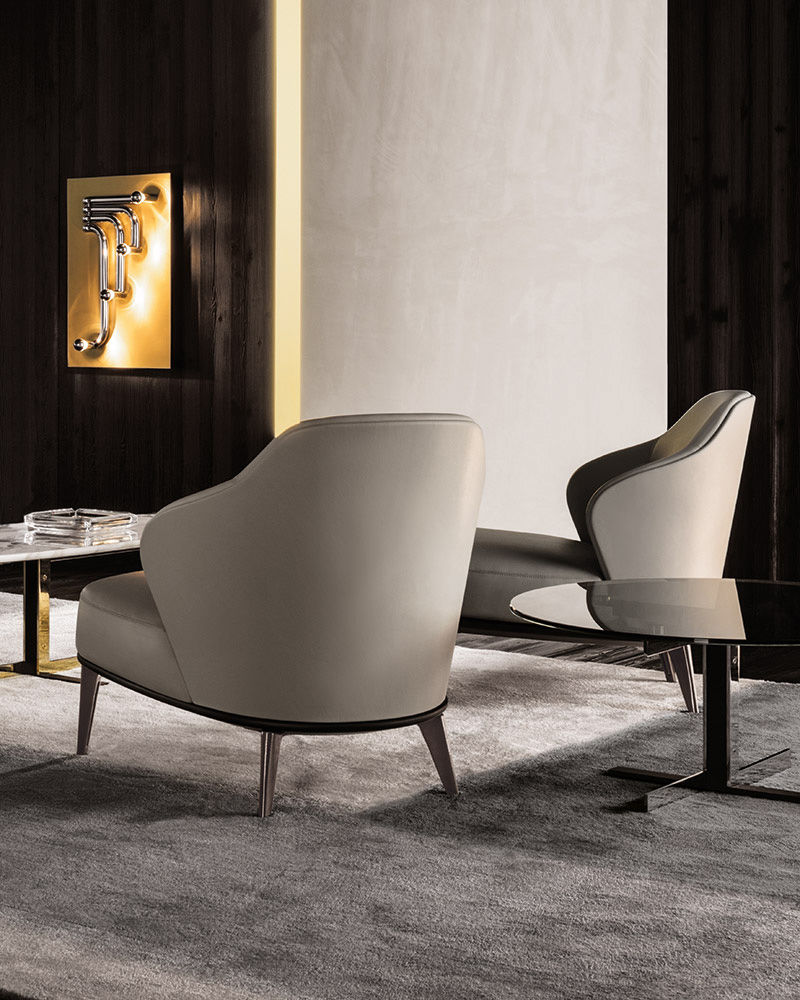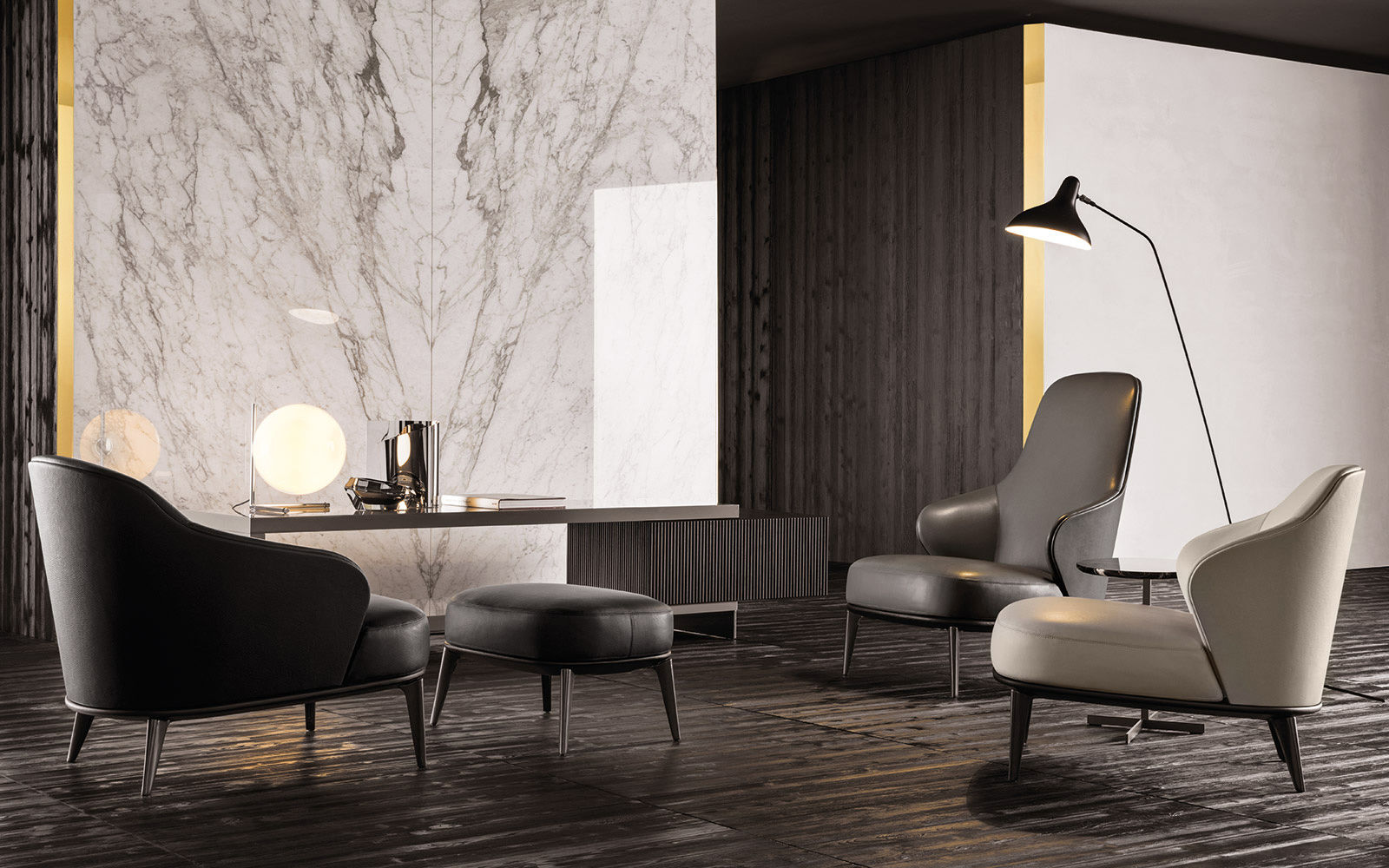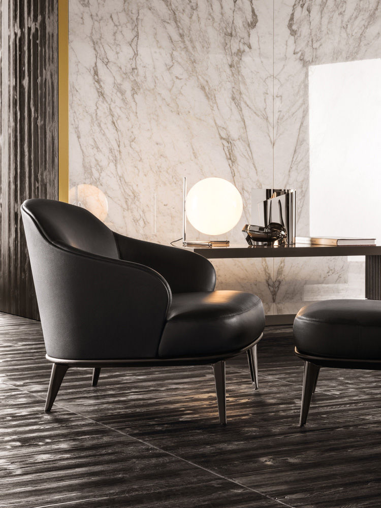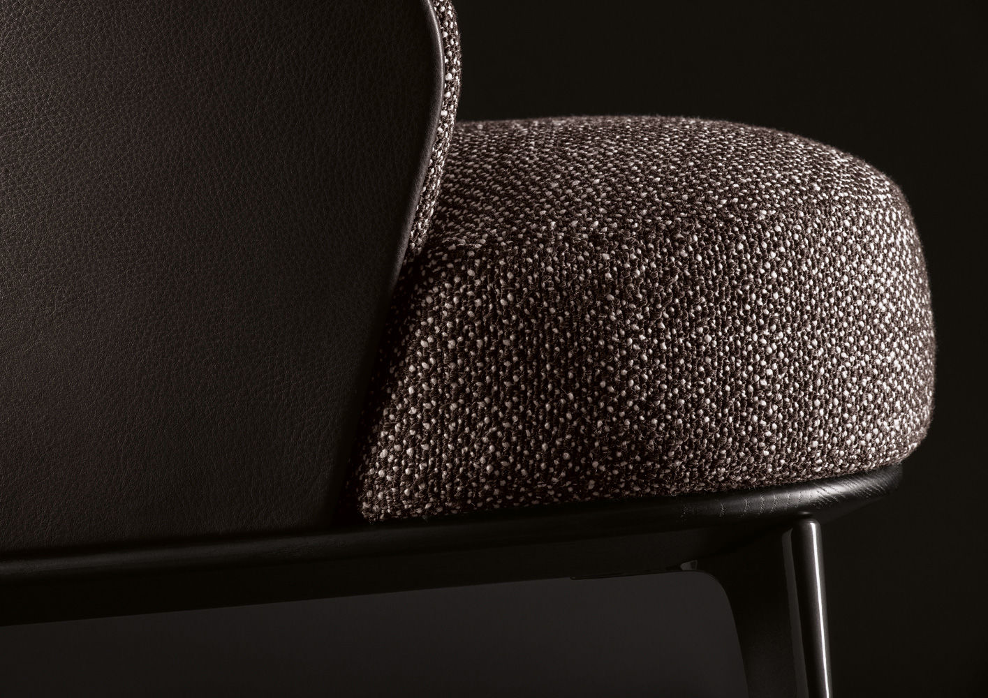 La familia Leslie comprende una poltrona, un sillón con brazos o sin ellos y un reposapiés. Con su refinada elegancia, estos elementos contribuyen a crear áreas de conversación íntimas y acogedoras tanto en los espacios domésticos como en los ambientes hosteleros: salones y salas de espera u oficinas de dirección.