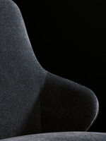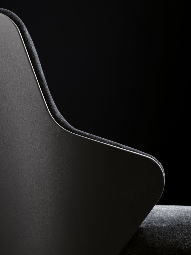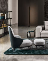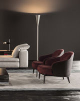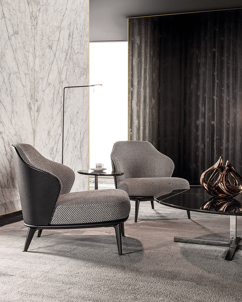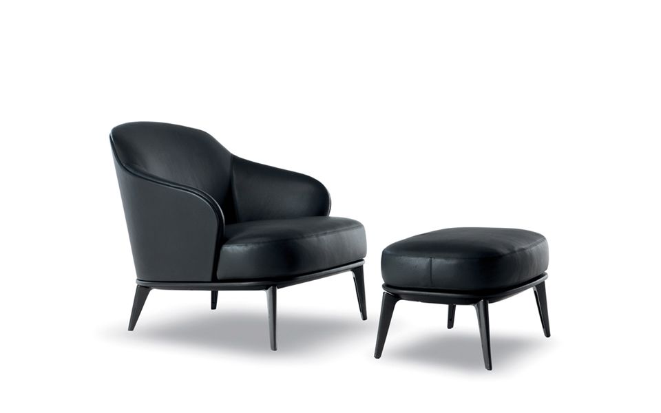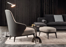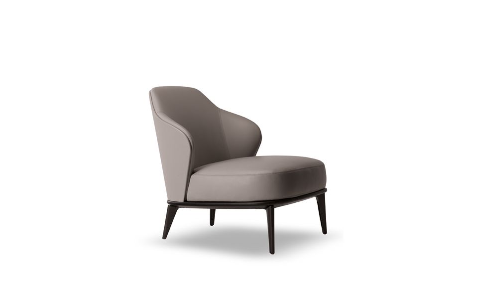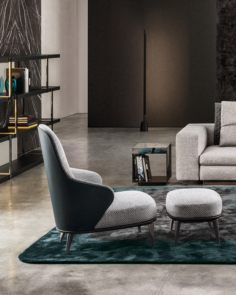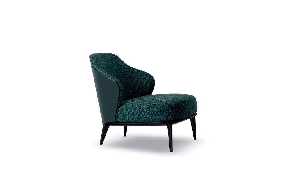 La familia Leslie comprende una poltrona, un sillón con brazos o sin ellos y un reposapiés. Con su refinada elegancia, estos elementos contribuyen a crear áreas de conversación íntimas y acogedoras tanto en los espacios domésticos como en los ambientes hosteleros: salones y salas de espera u oficinas de dirección.