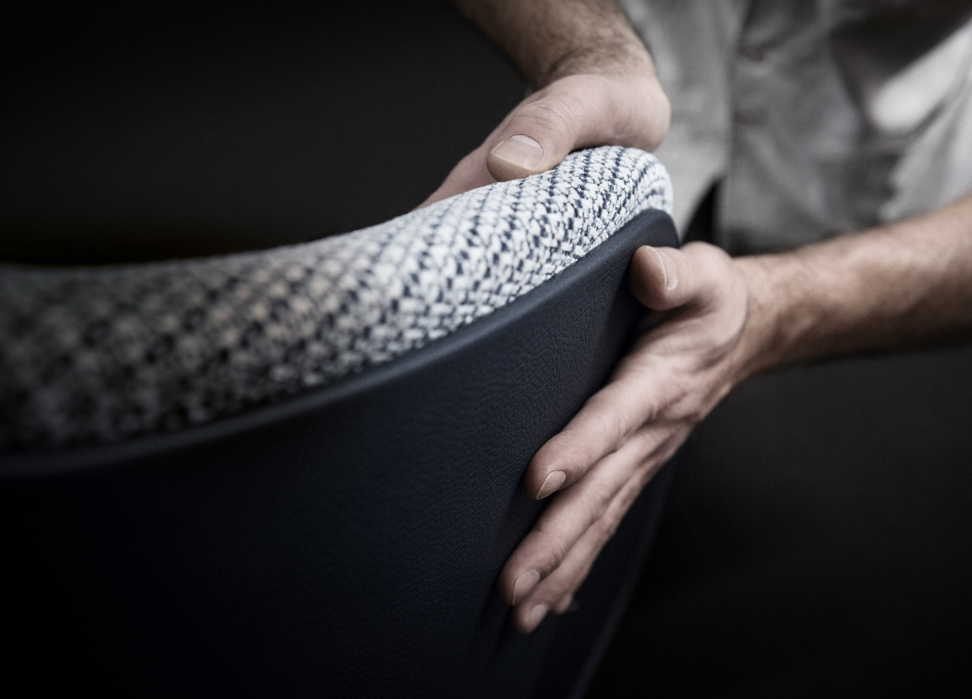 The external shell is made of expanded structural Baydur® and upholstered exclusively in leather. Internal contoured shell made of Baydur® CSP embedded in flexible, flame-resistant polyurethane foam. Laminated to the inner shell of the wing-back chair (bergère) is an additional, softer Memory Foam insert. Seatbase is in solid ash with open pore Moka colour stain fastened to a metal underframe with high-rubber-content elastic webbing. The seat is made of high resilience variable-density polyurethane foam with a center insert made of steel pocket springs that ensure the seat retains its shape.