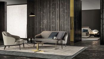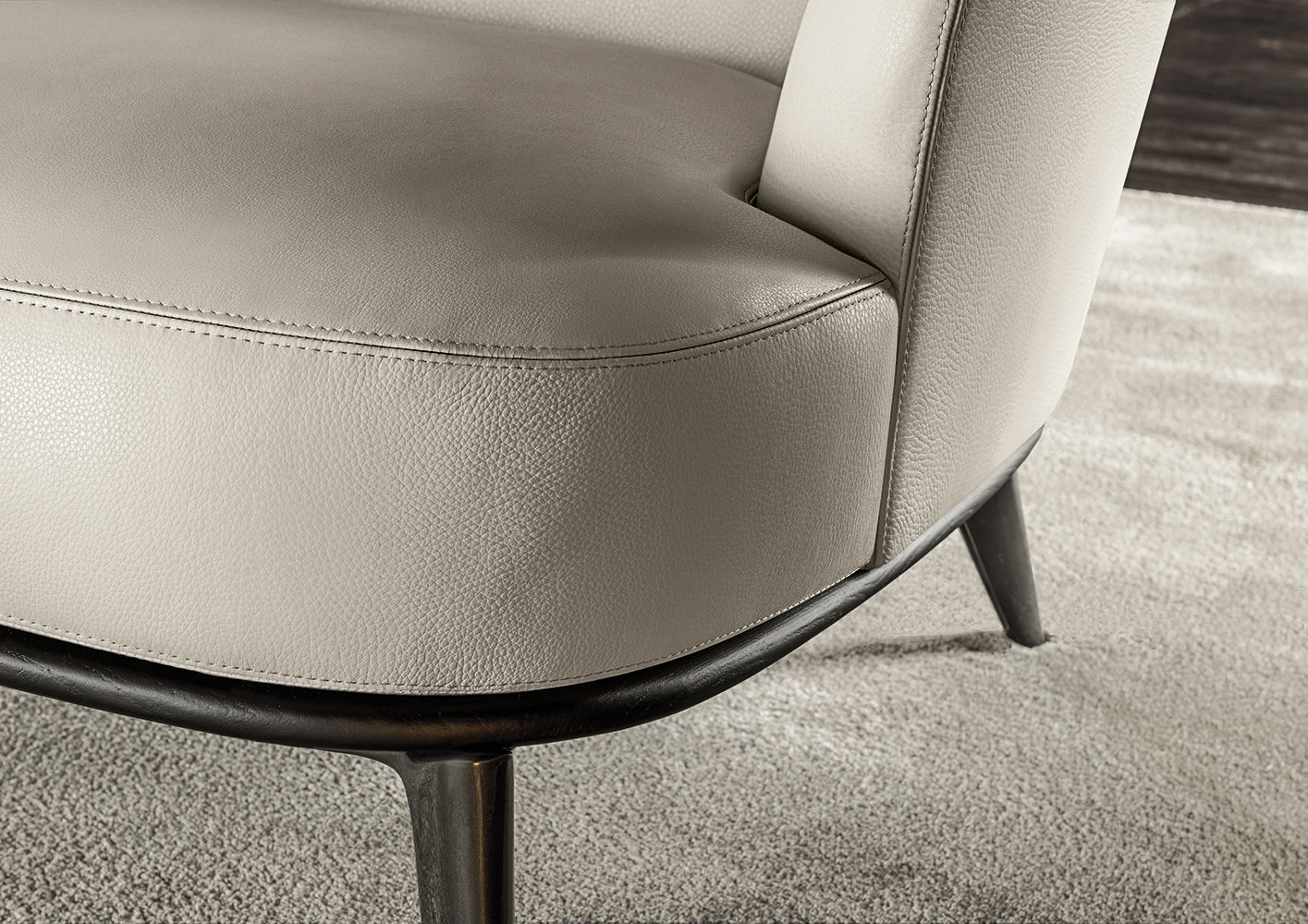 El sofá Leslie se caracteriza por sus ligeros volúmenes y por una confección que expresa toda la maestría artesanal que desde siempre caracteriza los productos de la empresa. El respaldo posee una línea envolvente y ofrece un elevado nivel de confort gracias a su aplicación de Memory Foam. El asiento apoya sobre una refinada estructura de madera maciza de roble teñida Moka con poro abierto. El sofá Leslie se mantiene elevado del suelo mediante patas de aluminio moldeado a presión color Peltre. Gracias a sus formas compactas, el sofá Leslie puede utilizarse para decorar con estilo y elegancia tanto ambientes domésticos de dimensiones reducidas como ambientes hosteleros: salones y salas de espera u oficinas de dirección. A diferencia de los homónimos sillones, que pueden presentar distintas combinaciones entre el armazón externo revestido en piel y la parte interna revestida en piel o tejido, el sofá Leslie solo puede realizarse con revestimiento monomatérico, o sea, revestido completamente en piel o completamente en tejido, eligiendo entre las innumerables propuestas de la exclusiva colección textil Minotti.