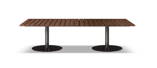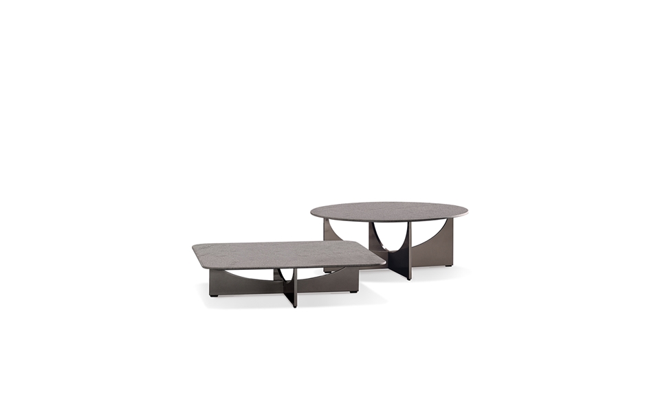 Por su parte, los otros elementos de la familia descansan sobre patas de caoba maciza teñida Dark Brown o de teca maciza, mientras que las mesas de centro siguen el diseño de la base en forma de X de aluminio del sofá de salón semicurvo. Propuestas con tablero circular o cuadrado, estas últimas están disponibles en cuatro tamaños y dos alturas con un tablero de piedra Basaltina cepillada de grano fino, que descansa sobre una base de cuna.