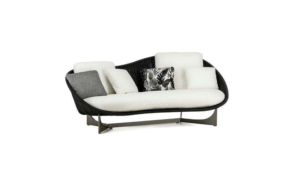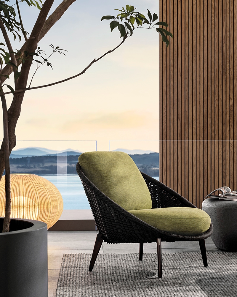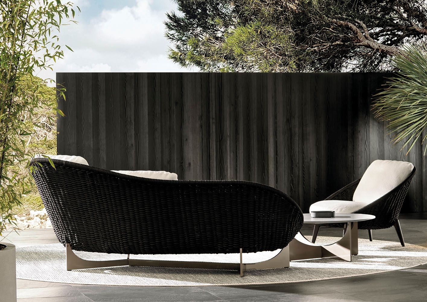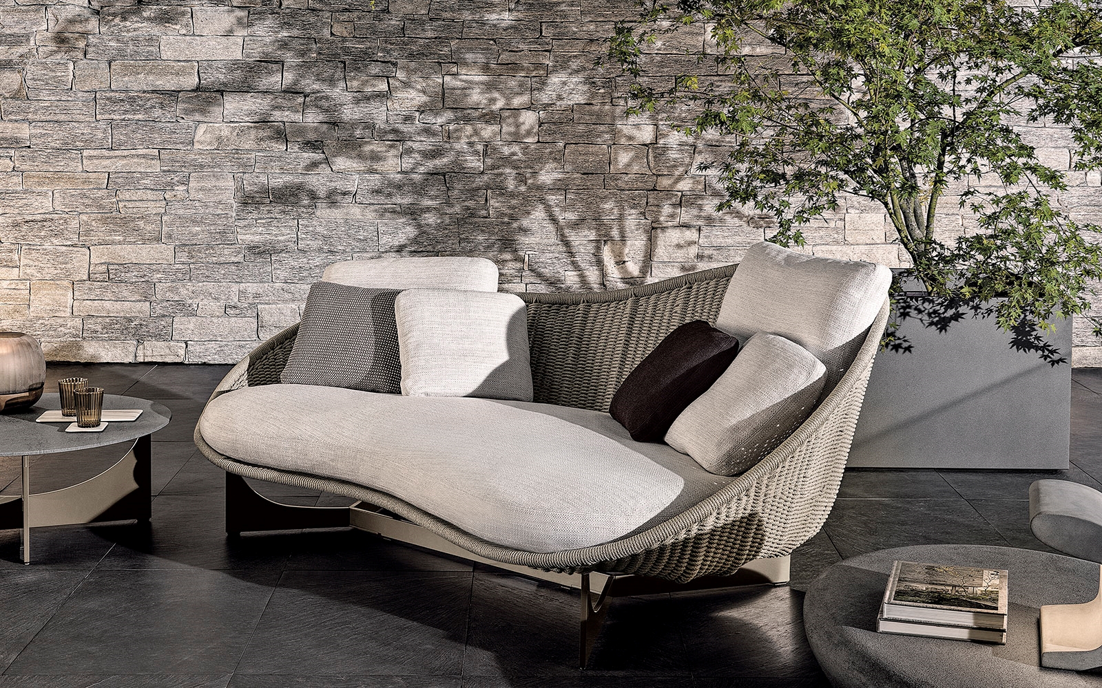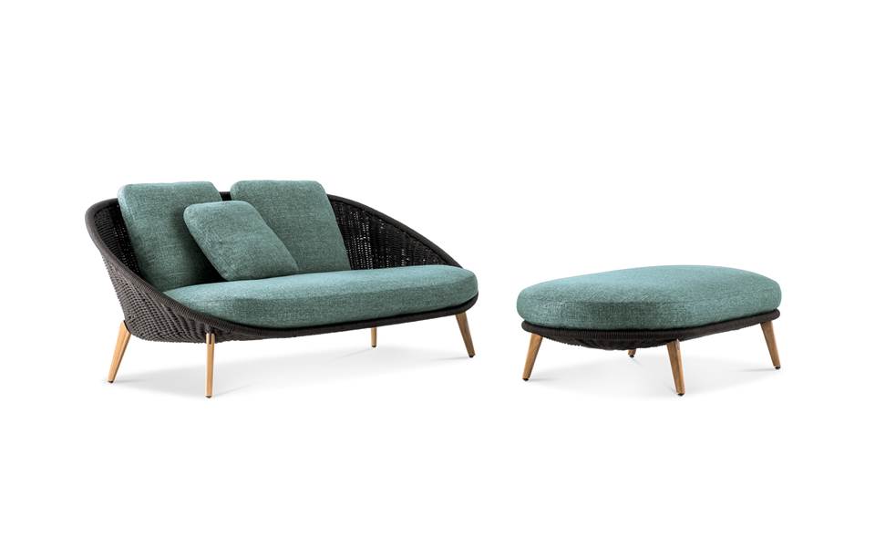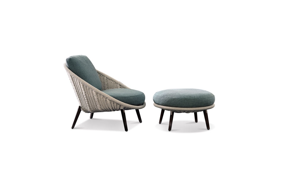 La familia Lido Cord Outdoor se compone de un sofá de salón semicurvo, un sofá lineal de dos plazas, un sillón y una butaca de comedor y salón, con un diseño envolvente que evoca la idea de un cómodo nido, además de un banco y un reposapiés.