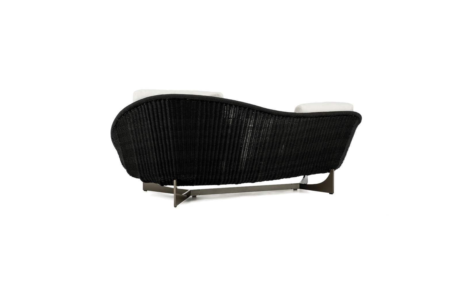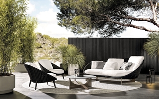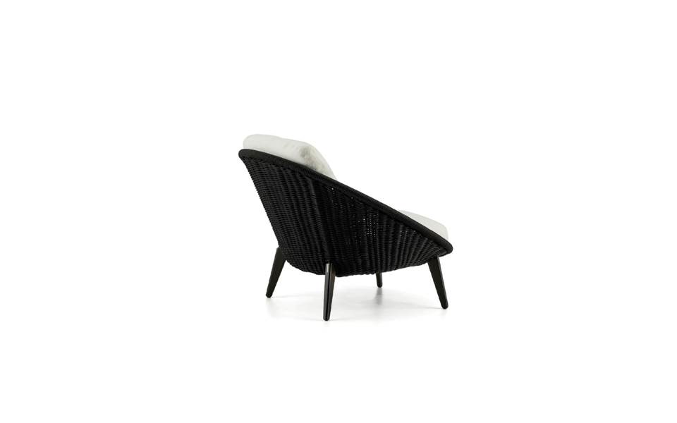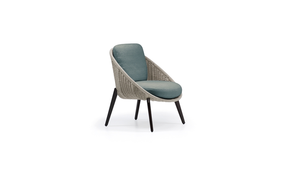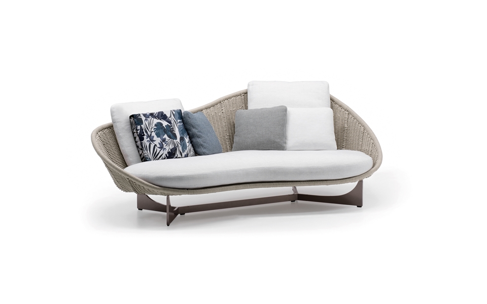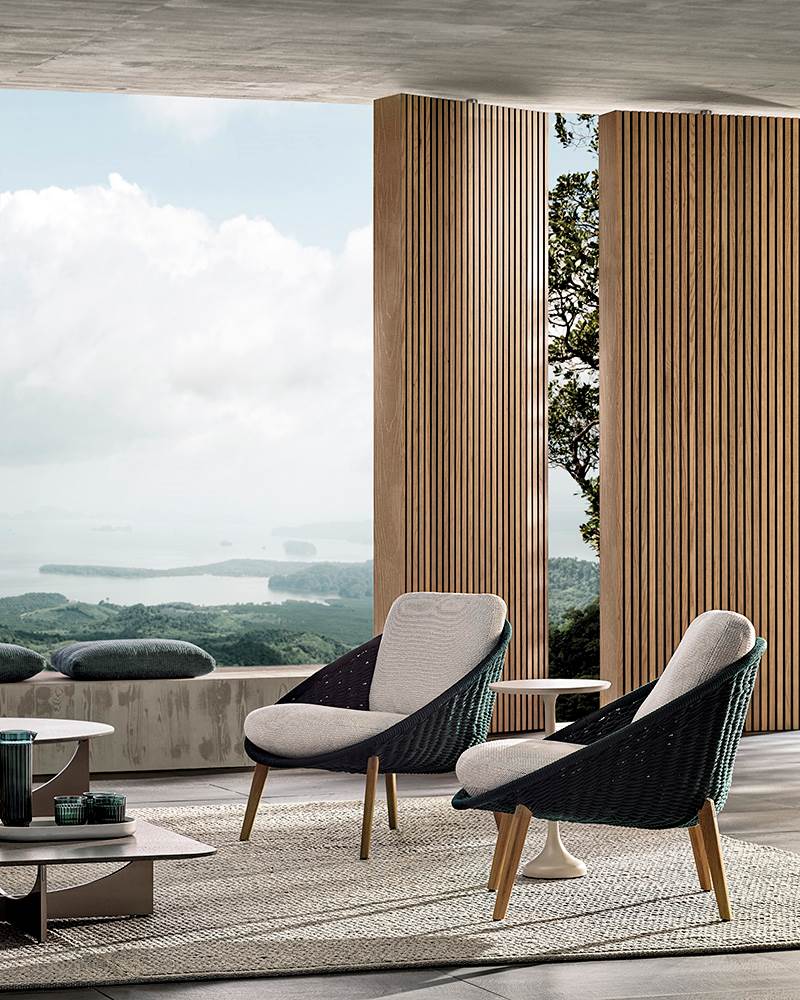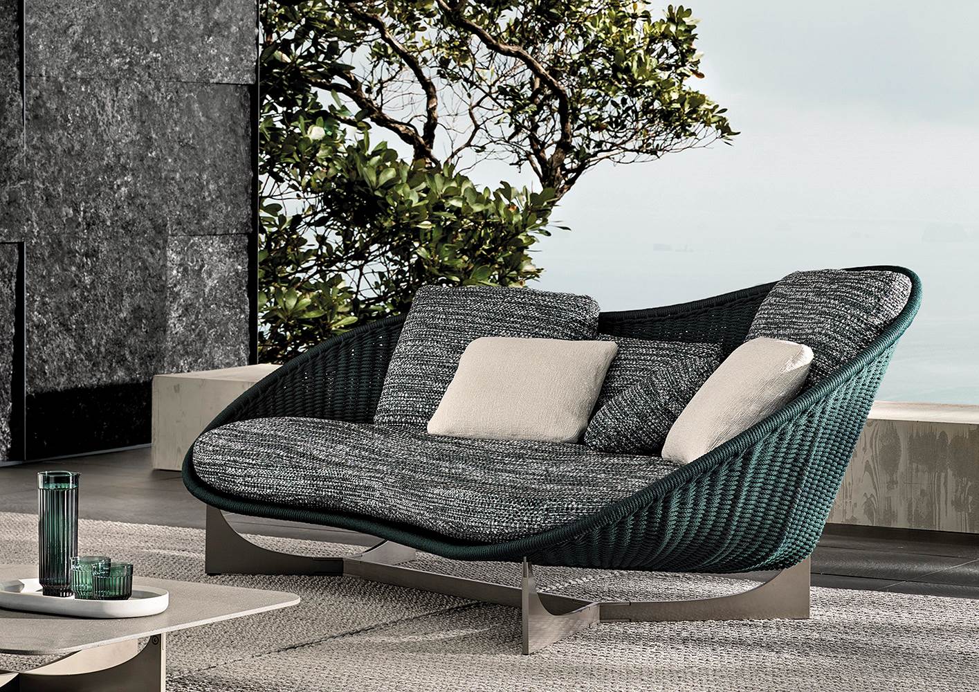 La familia Lido Cord Outdoor se compone de un sofá de salón semicurvo, un sofá lineal de dos plazas, un sillón y una butaca de comedor y salón, con un diseño envolvente que evoca la idea de un cómodo nido, además de un banco y un reposapiés.