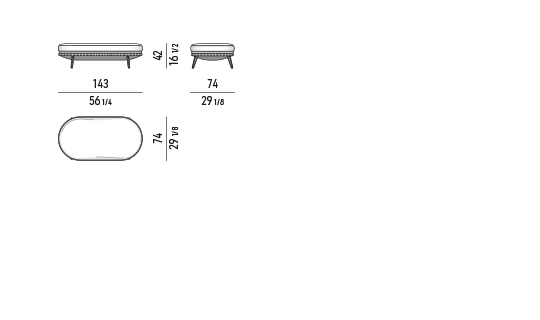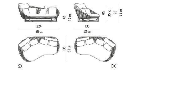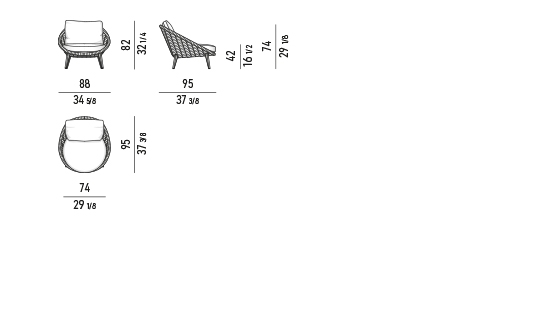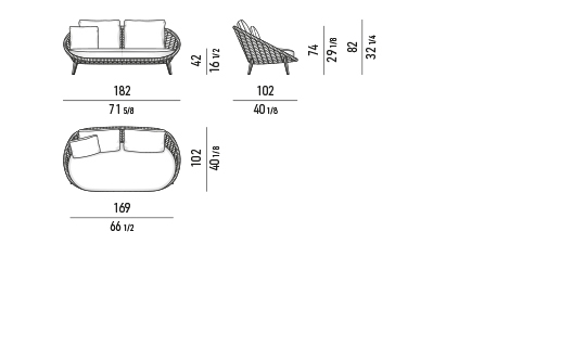 Seat and backrest cushions in high-resilience polyurethane foam and water-repellent, eco-friendly viscose fibre. In order to better protect the padding from water and humidity, all the cushions are upholstered in water-repellent polyester fabric. All the accessories used in production – zippers, thread – are water-repellent and therefore suitable for outdoor use. The seat and backrest cushions of the 182 cm sofa and of the 88 cm armchair are reversible.