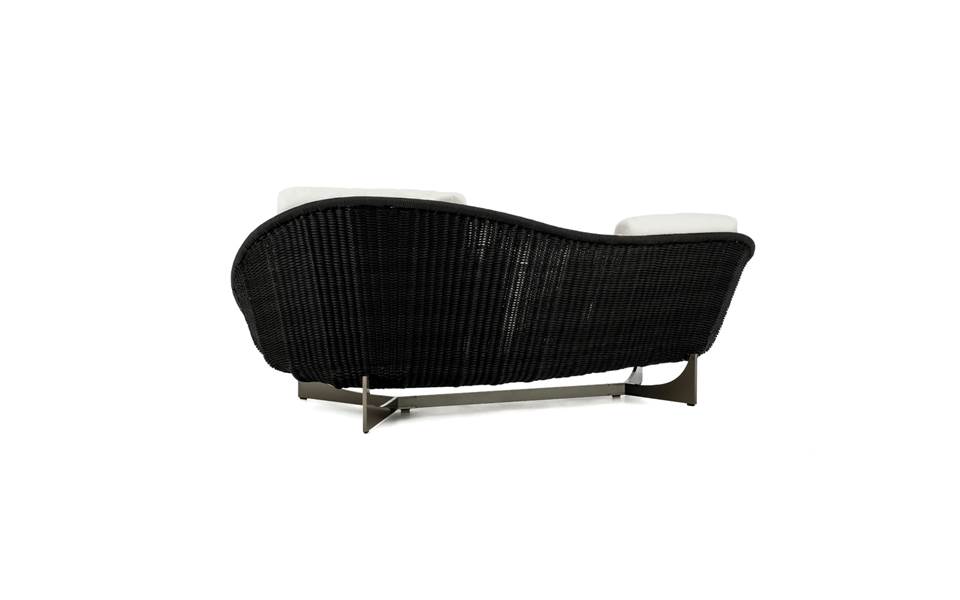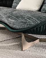 El sofá de salón semicurvo, en particular, tiene una característica base de aluminio pintado en Bronce con acabado brillante anti-touch, un elemento destacado con una fuerte matriz escultórica: por un lado ofrece un asiento formal, por otro adquiere más profundidad para convertirse en una bergère, con un respaldo que dibuja un suave nicho. Una invitación sincera a tumbarse de forma más íntima y relajada.