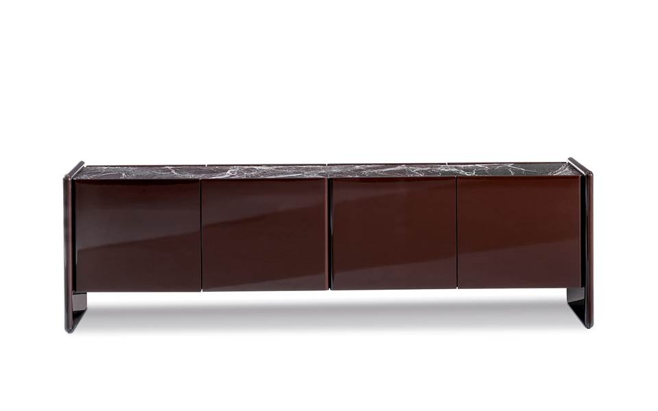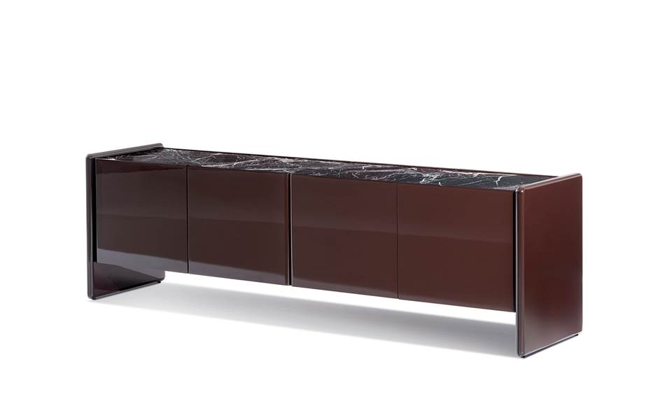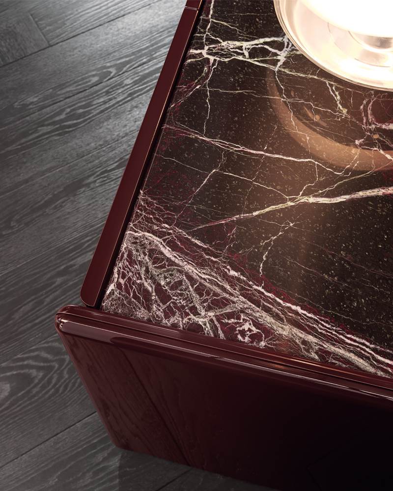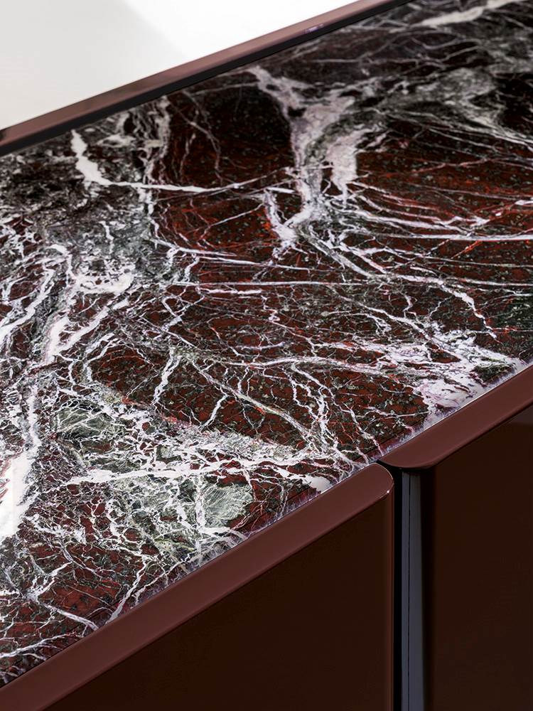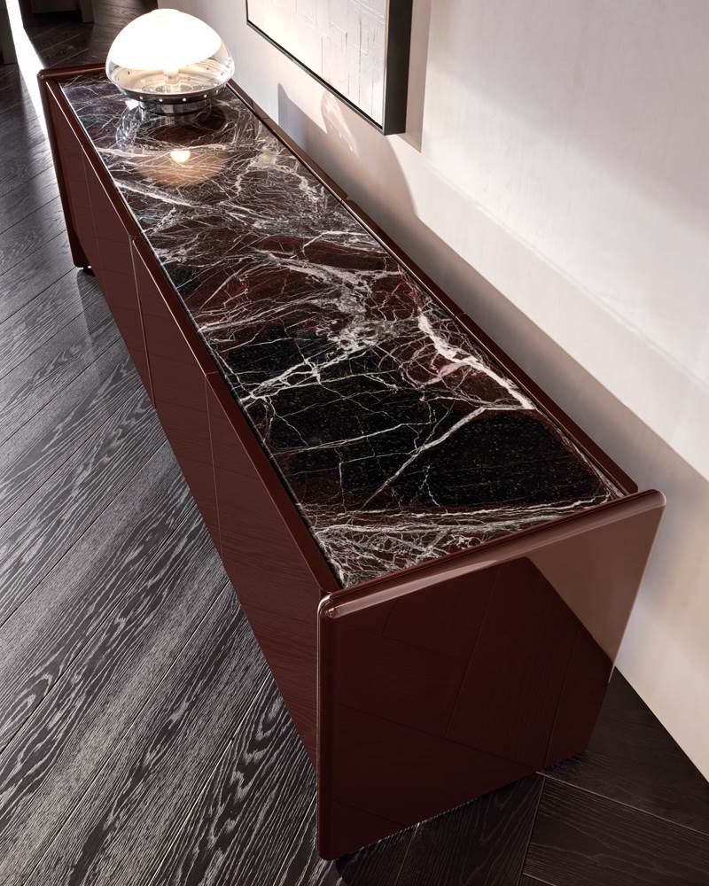 - external finish, glossy lacquer Burnt Brown / interior structure in brushed ash with open-pore Black lacquer / top in Rosso Levanto marble or glossy lacquer Burnt Brown;