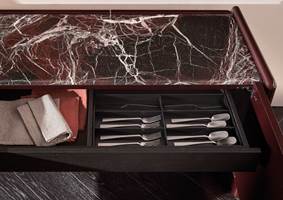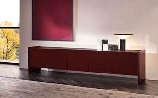 - MDF, 20 mm thick, glossy lacquer in Burnt Brown, Moka or Moss colour, contoured. The DINING sideboards have doors, inside is a shelf in tempered bronzed glass, 8 mm thick; in the right-side compartment there is also a drawer that contains a Black saddle-hide cutlery tray. Internal and external finish of the drawer is always ash veneer, with the top in Canaletto walnut, the finish of the drawer will be walnut. The LIVING cabinet comes with large drawers, internal finish of the drawers matt lacquered in the same colour as the external lacquer. All drawers glide on full-extension runners with Blumotion closure. Adjustable ABS feet attached to the side panels.