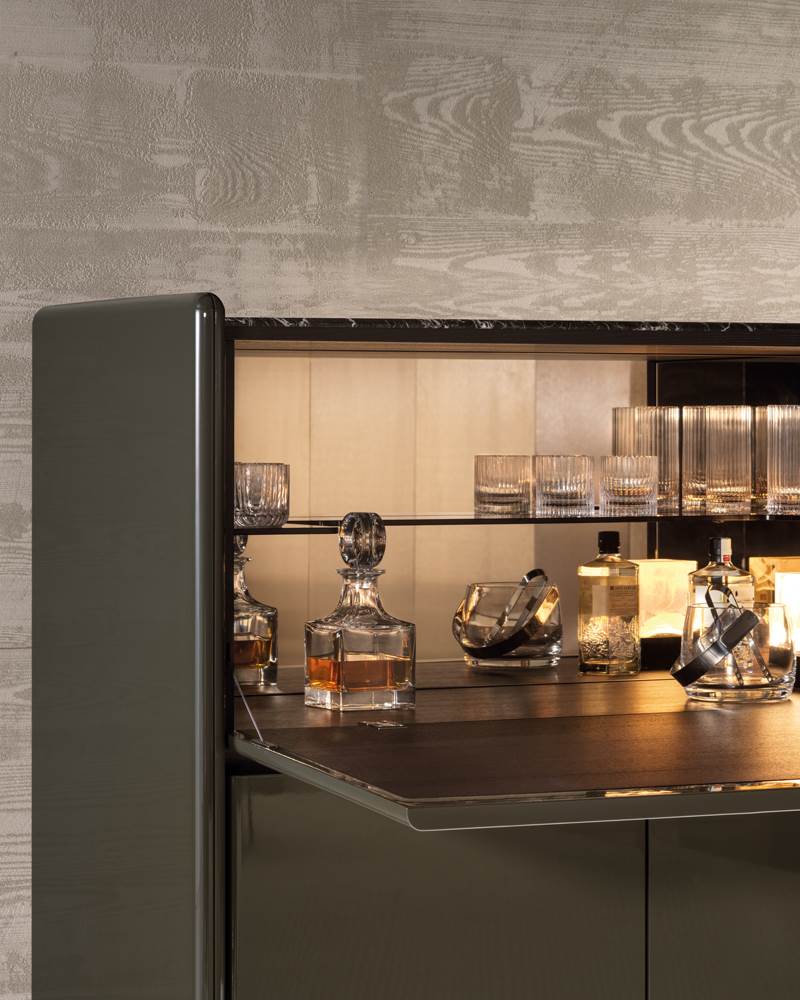 - MDF, 20 mm thick, glossy lacquer in Burnt Brown, Moka or Moss colour, contoured. The VERTICAL cabinet has two lower doors and an upper flap door. Behind the two lower doors is a Bronze tempered glass shelf, 8 mm thick, 1 drawer and a mirror attached to the back panel. Inside the interior drawer is a cutlery tray in Black saddle-hide. Behind the flap door is an interior shelf in Bronze tempered glass, contoured, 8 mm thick, and a mirror attached to the back- and internal side panels. When the flap door is in glossy lacquer, the internal part of the flap door is covered with a wood panel that matches the finish of the interior structure. Interior and exterior finish of the drawers is in the same wood as the structure. All drawers glide on full-extension runners with Blumotion closure. Inside the VERTICAL cabinet, in the upper part, is n. 1 LED light-strip with on/off switch (wall socket feed). Adjustable ABS feet attached to the side panels.