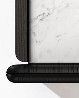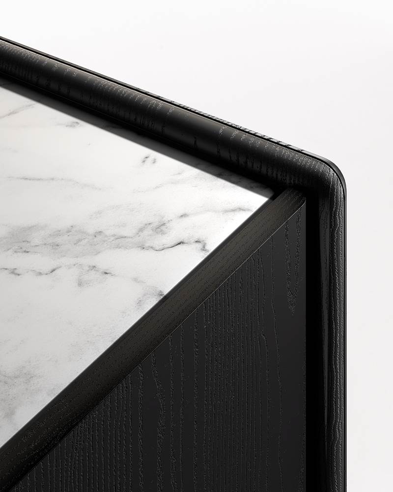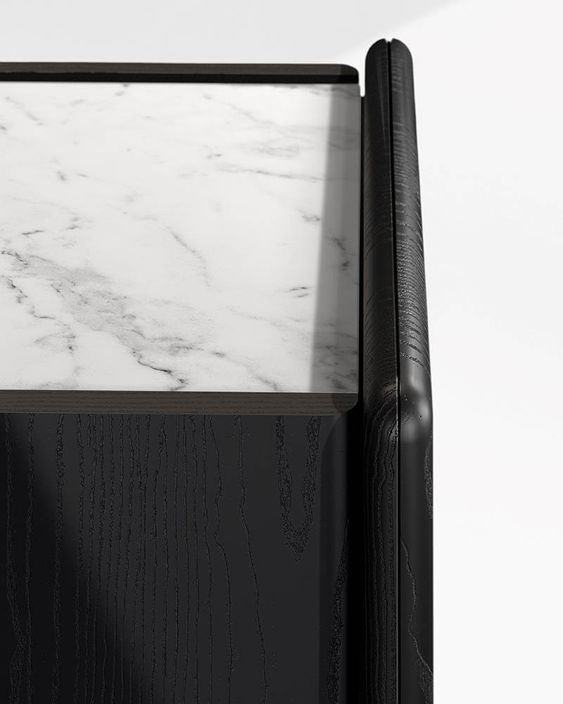 - external finish in brushed ash with open-pore Bblack lacquer finish / interior structure in brushed ash with open-pore Black lacquer finish / top in Nero Marquina or Bianco Carrara marble.