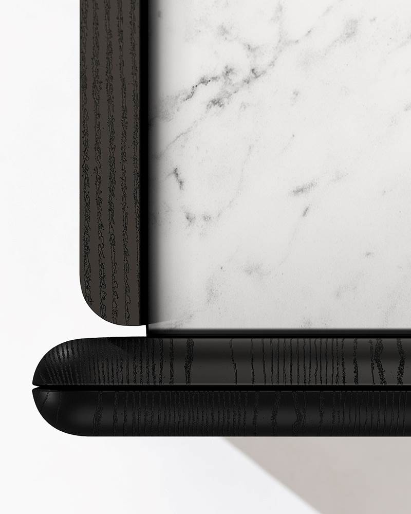 - external finish in brushed ash with open-pore Black lacquer finish / interior structure in brushed ash with open-pore Black lacquer / top in Nero Marquina or Bianco Carrara marble.
