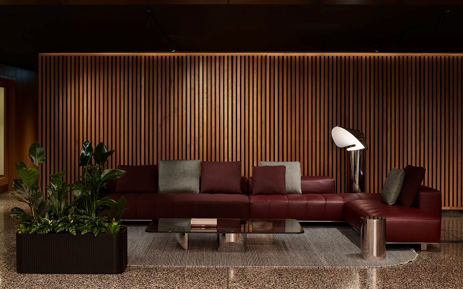 No en vano, la elección del mobiliario aporta un encanto atemporal y decora el ambiente con los tonos cálidos de sus tapizados: en color burdeos, los sistemas de asientos Goodman y Freeman, acompañados por las mesas auxiliares Pilotis de acero brillo – todos diseñados por Rodolfo Dordoni – y las mesas auxiliares Wedge de Nendo, aportan confort al centro del proyecto.
