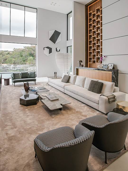 Un proyecto de mobiliario de carácter elegante y refinado protagonizado también por el sistema de asientos Freeman, pensado para conferir carácter a una de las salas de la casa. Completan su cálida y acogedora atmósfera el sillón Cortina y las mesitas de la colección Calder Bronze y Ritter.