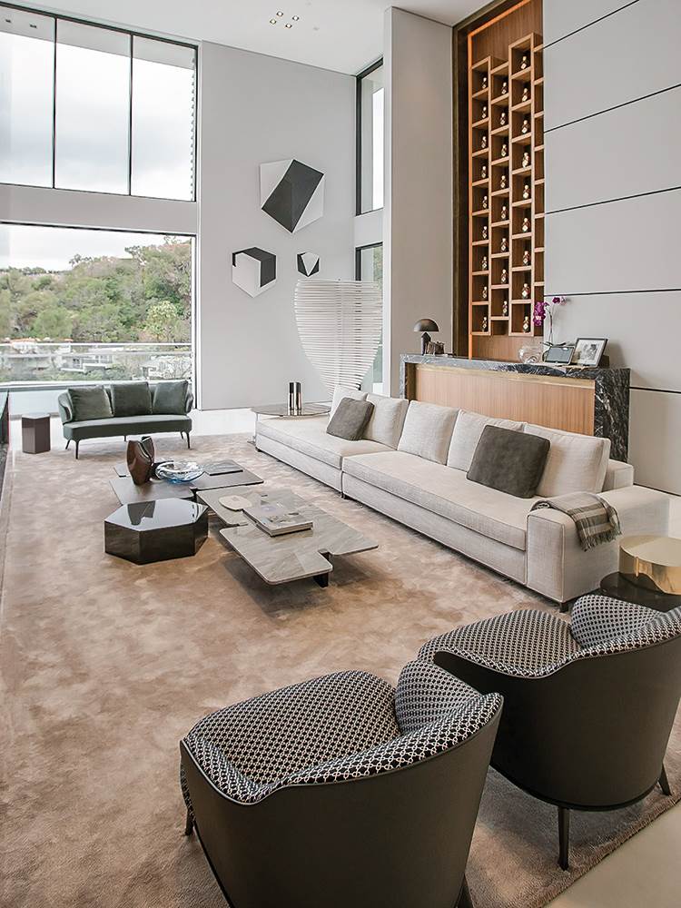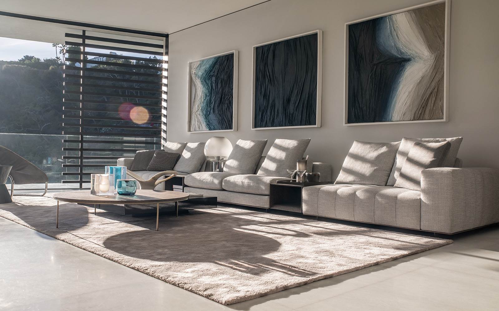 Para amueblar la amplia sala principal, iluminada con ventanas hasta el techo, Minotti LA ha seleccionado atentamente numerosos productos de la colección Minotti. Entre ellos cabe destacar el sofá Williams, una verdadera invitación al relax y al máximo confort, combinado con la mesita joya Benson y con las butacas Leslie.