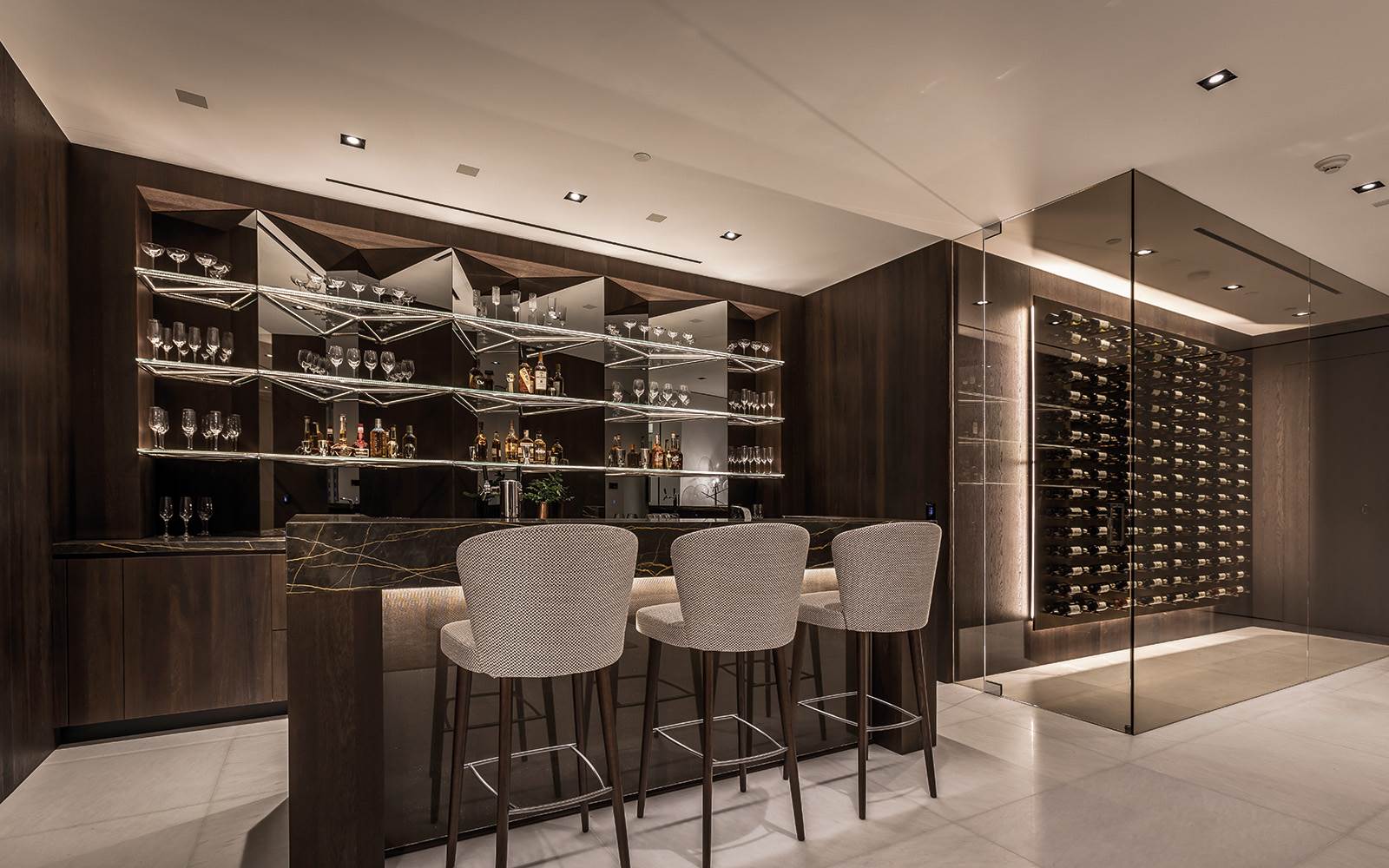 Los espacios internos que comunican directamente con el exterior son la joya de la corona de esta lujosa residencia particular. Entre ellos, la cocina y el área lounge adyacente, que dan a un espacioso patio amueblado con dos asientos Andersen acompañados de la icónica mesita Cesar y de la poltrona Jensen. Poco distante, la zona bar-lounge presenta tres taburetes Aston de asiento suave y acogedor.