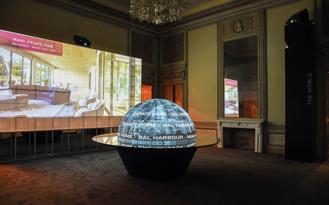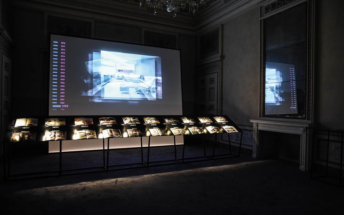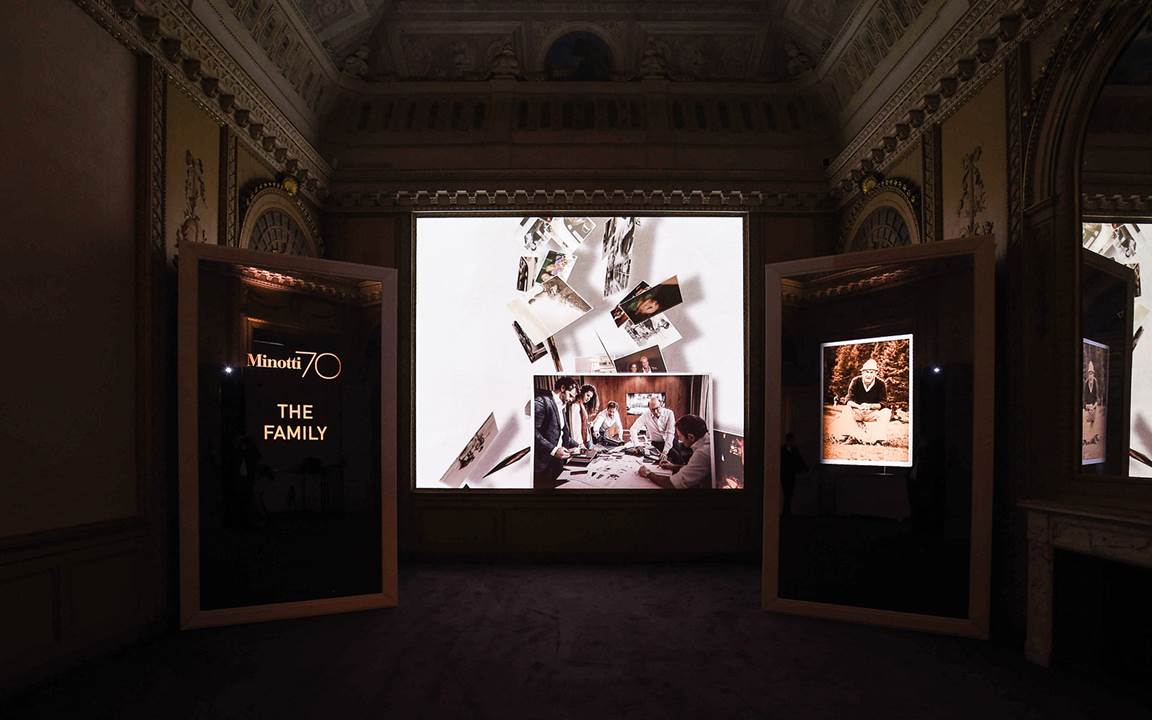 En la Sala de los tapices, un sistema de proyecciones reflejadas al infinito ha abrazado el espacio con un retrato familiar rico en objetos y recuerdos personales para contar la intuición de Alberto Minotti, desarrollada por las generaciones sucesivas; en el centro de la Sala del trono se ha colocado un gran mapamundi, en diálogo con la pared dinámica trasera, para guiar al visitante en el descubrimiento de los lugares y las obras de Minotti a lo largo del mundo; y en la pared principal de la Sala de las aves, un sistema articulado de proyecciones interactivas ha recorrido la historia y los proyectos de los últimos veinte años, fruto de una visión compartida con el arquitecto Rodolfo Dordoni.