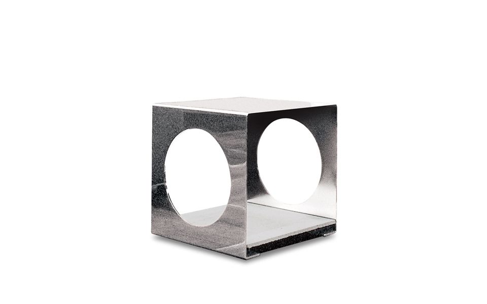 Algo que trasciende el diseño, que abre un camino en el mundo de la decoración. Un gesto expresivo, escultural, una fórmula alquímica que une el círculo y el cuadrado. En los materiales el juego se hace más sutil: la contemporaneidad del acabado Black-Nickel se une a la eternidad de la piedra lávica de la base.