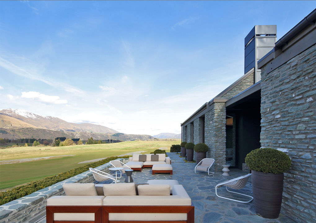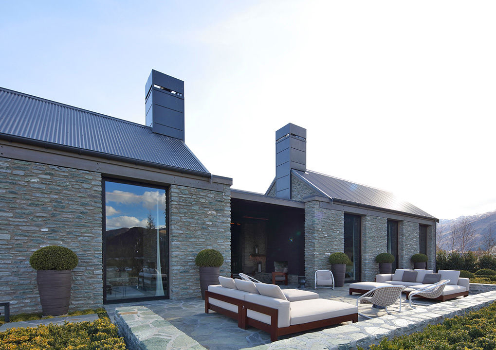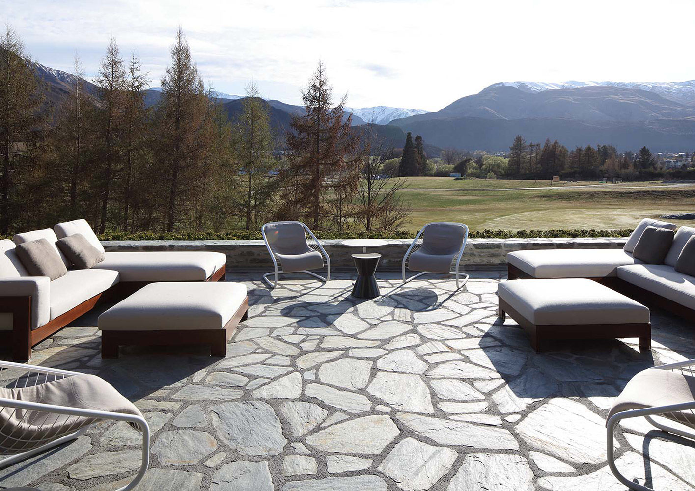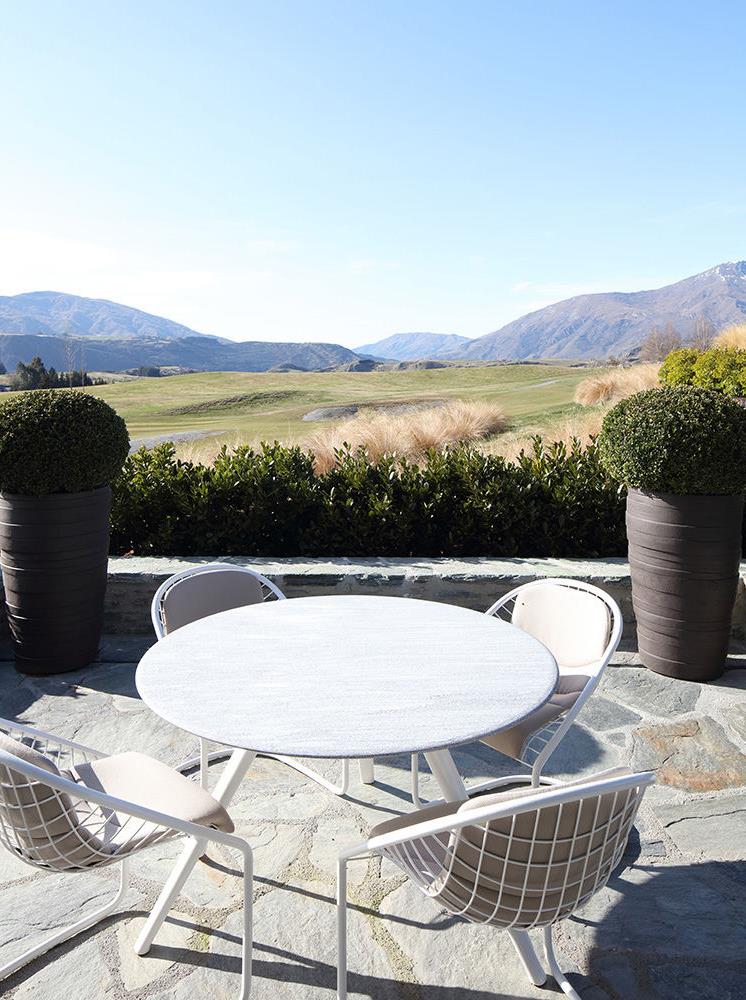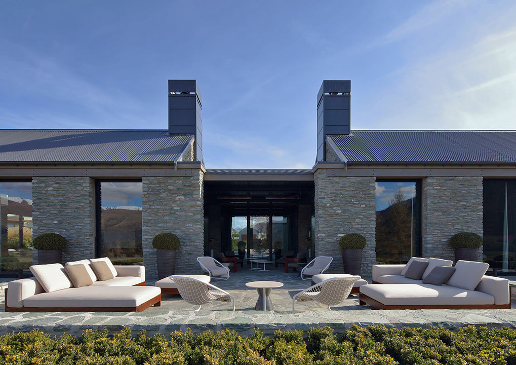 Una acogedora y refinada casa de vacaciones construida en la zona de Queenstown, en el sudoeste de Nueva Zelanda. Rodeada de una naturaleza incontaminada, esta casa es el refugio predilecto de sus propietarios, que transcurren allí mucho tiempo tanto en verano como en invierno, dada la cercanía de campos de golf y estaciones de esquí. El proyecto es obra del arquitecto Andrew Patterson, que realizó un edificio que se inserta armoniosamente en el paisaje circunstante, privilegiando formas minimalistas y materiales naturales, como la piedra y la madera. El patio, que goza de una magnífica vista a las montañas, se ha amueblado íntegramente con productos de la Lifescape Collection: composiciones del sistema de asientos Alison Iroko «Outdoor» combinados con sillones Cortina «Outdoor» y una mesa de comedor Evans «Outdoor» con tablero de gneis plateado, rodeada de sillas Cortina «Outdoor».