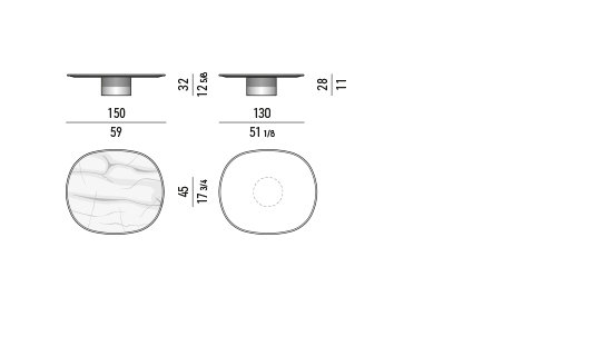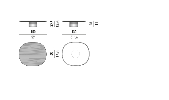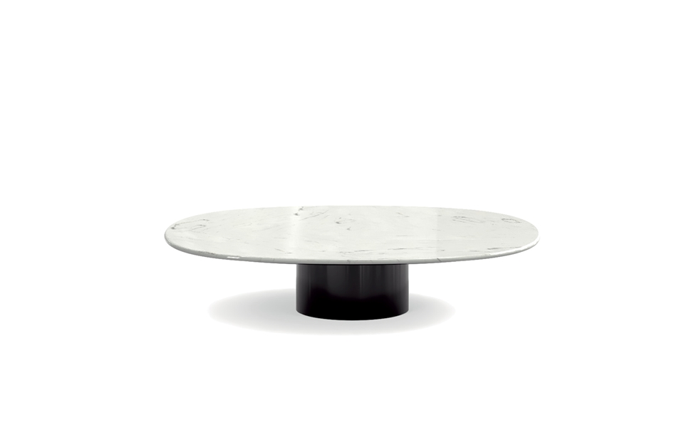 Su forma pura y esencial se compone de una base cilíndrica, en acero inoxidable brillo o metal pintado en color Black Coffee, que sostiene un tablero elíptico de líneas redondeadas, disponible en mármol o madera.