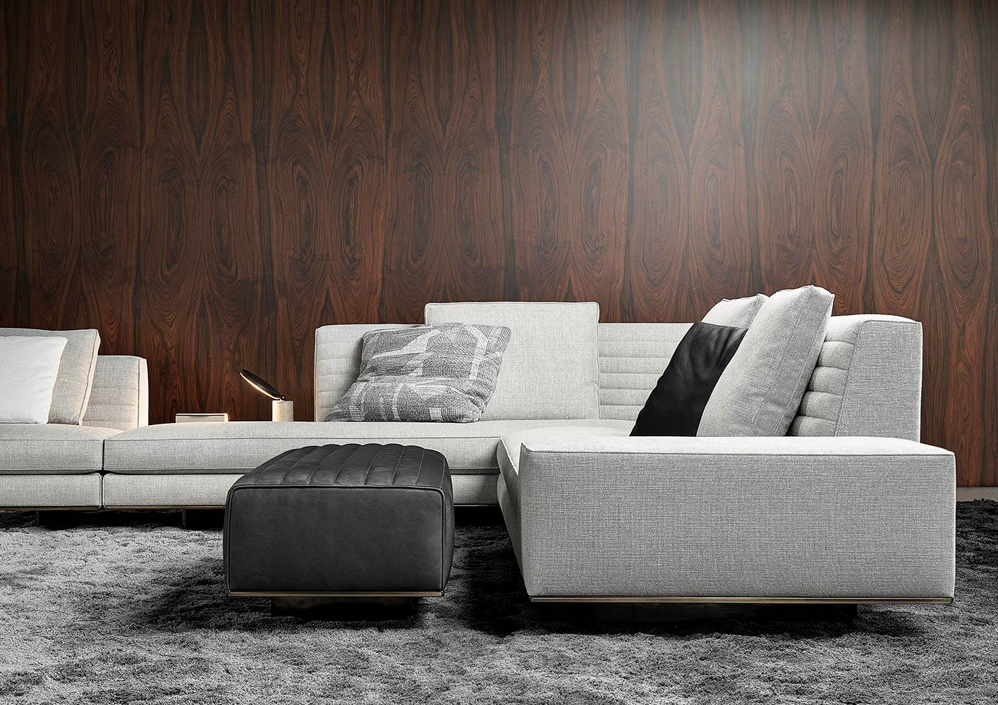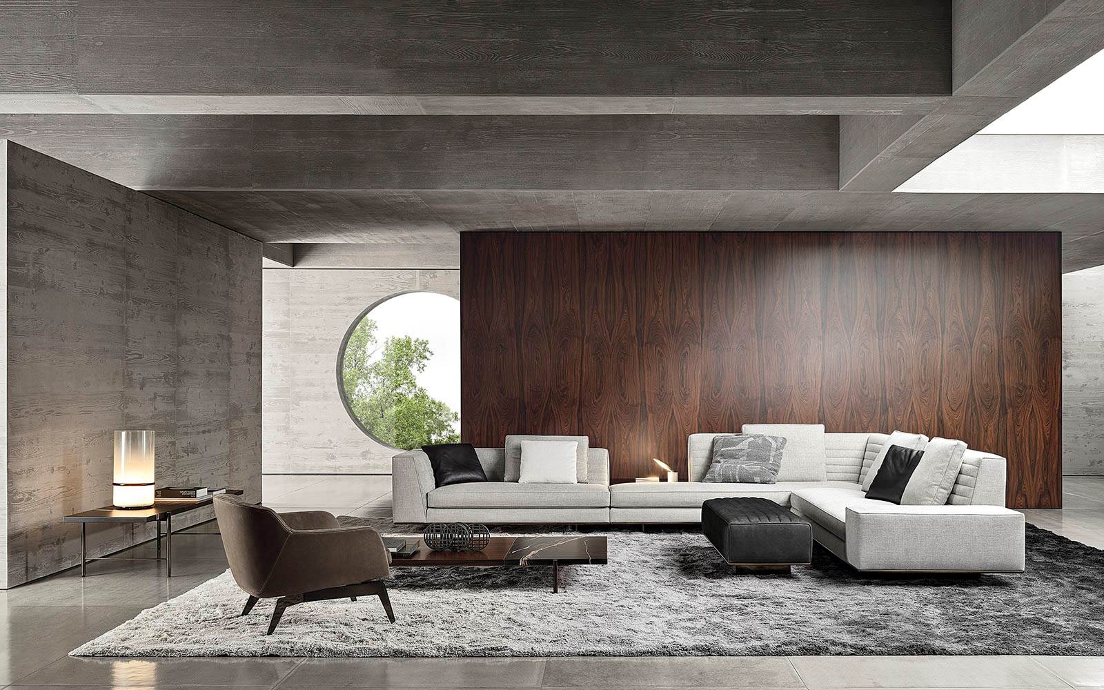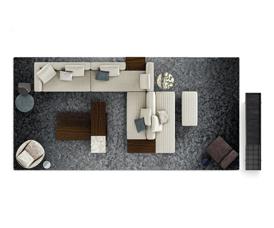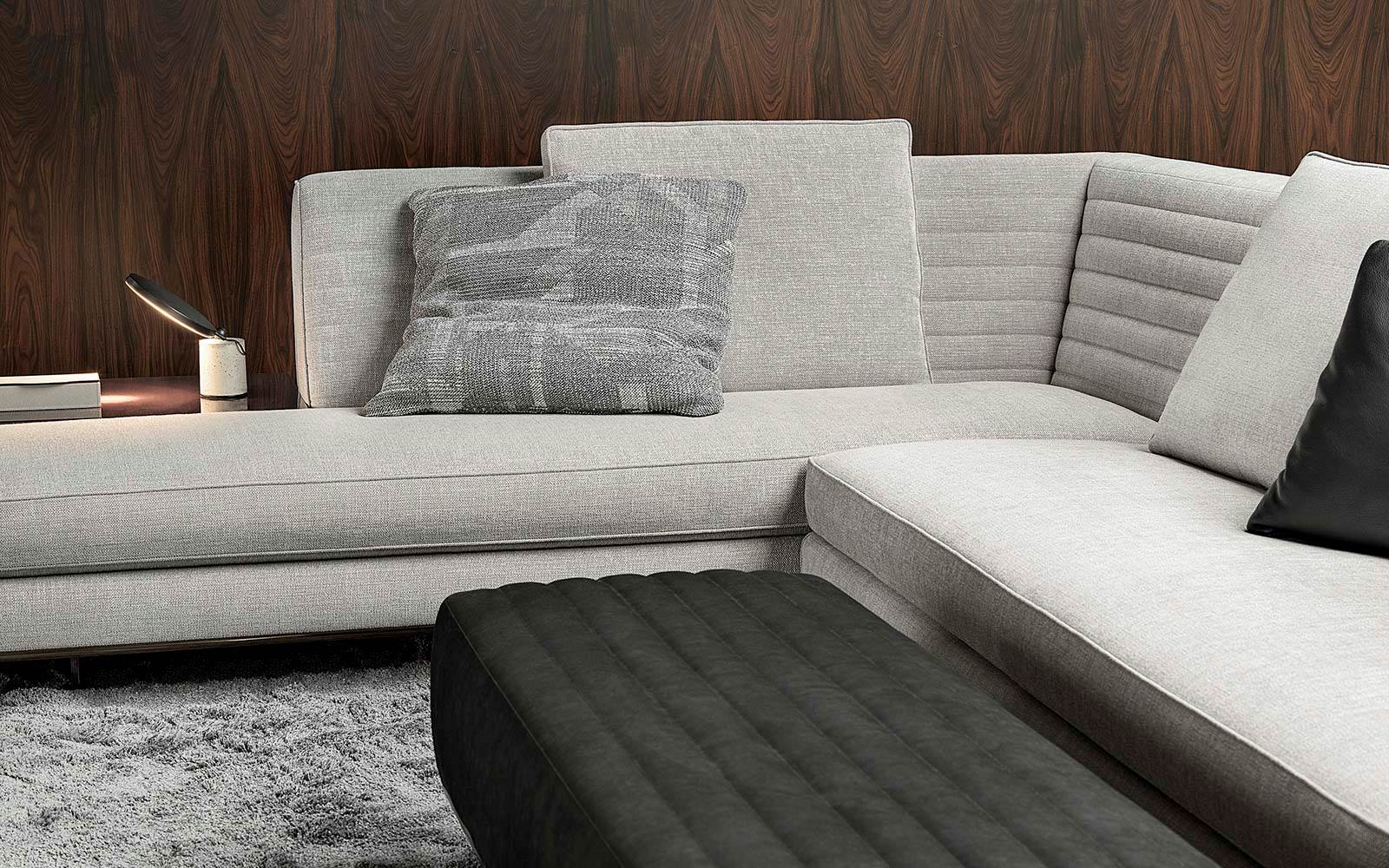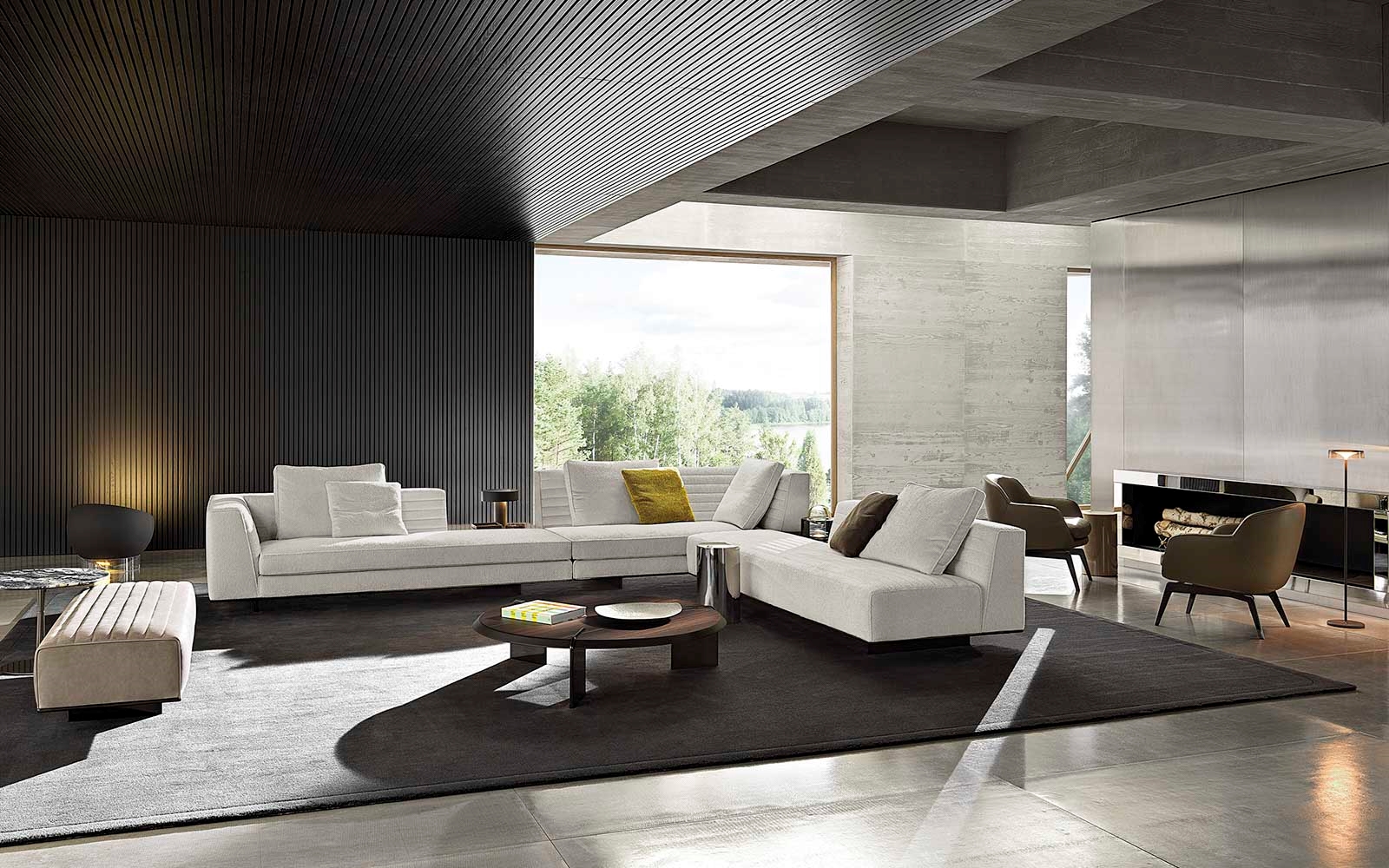 Roger lleva la firma de Rodolfo Dordoni y ha sido desarrollado en colaboración con Minotti, cuya impronta se encuentra en los suaves volúmenes, los sofisticados tapizados y la sastrería.
