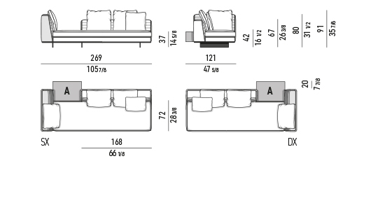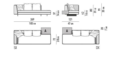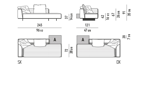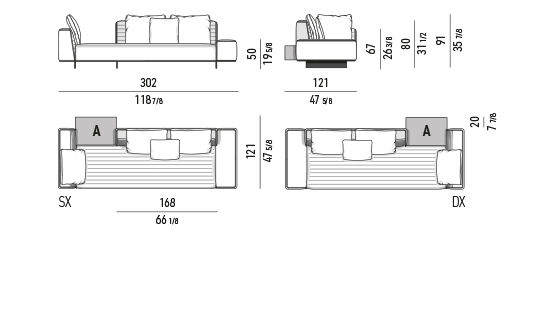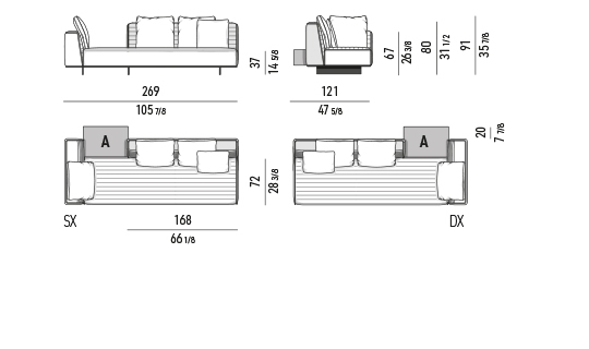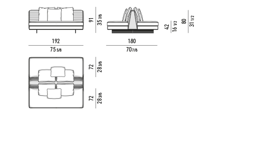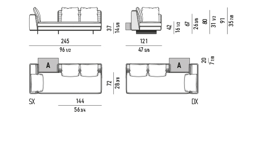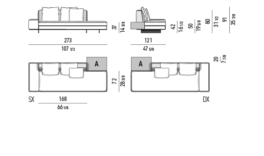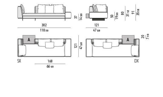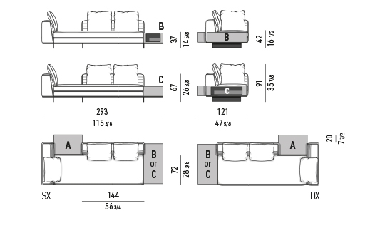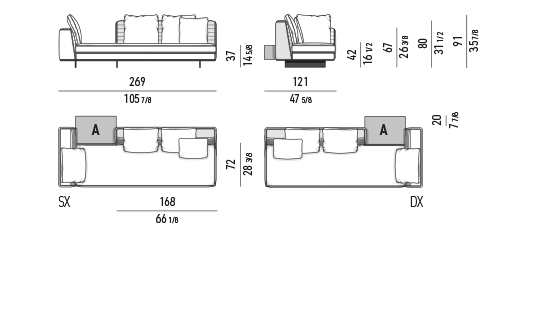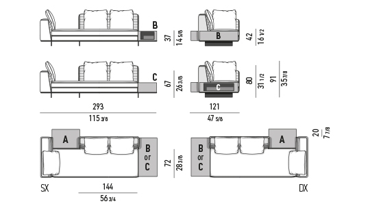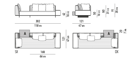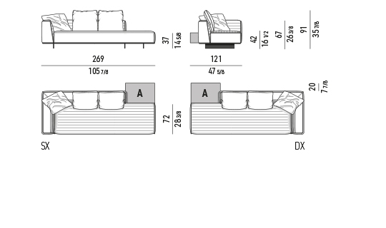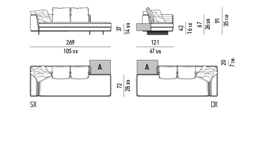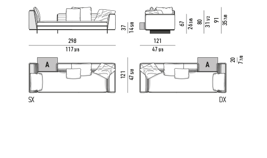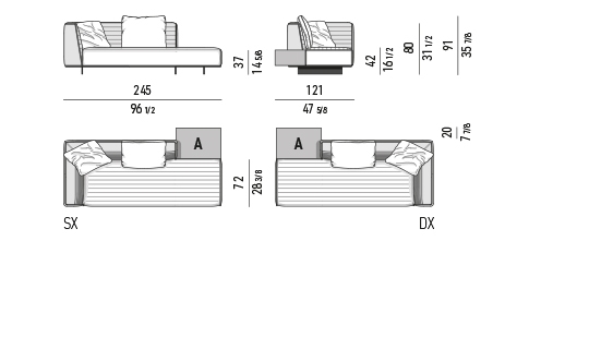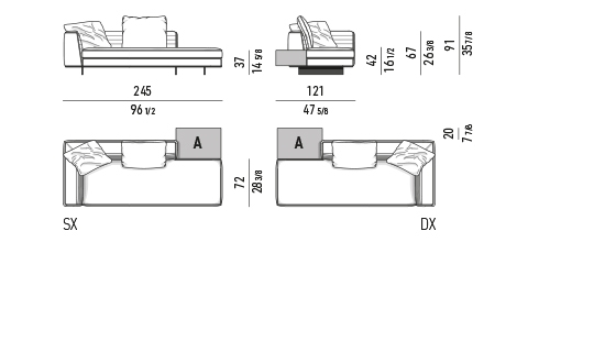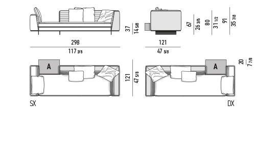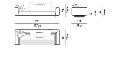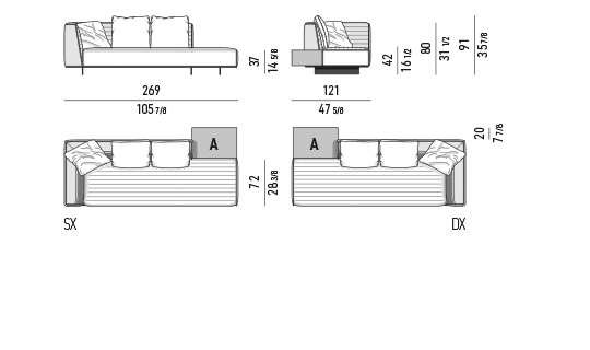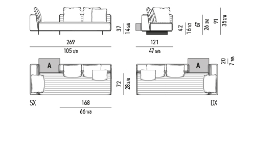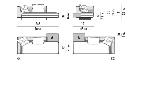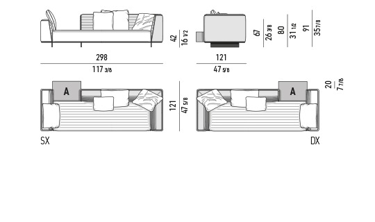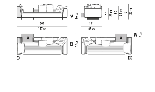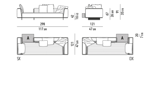 El sistema incluye tres tipos de elementos: Roger Suite, con un cojín como asiento y una profundidad de 101 cm; Roger Spring, un asiento de una sola pieza de la misma profundidad, con un relleno interno de muelles ensacados que garantiza la indeformabilidad del asiento, completamente acolchado en la superficie; por último, el sofá Roger Spring con una profundidad reducida a 94 cm y sin reposabrazos. Los elementos pueden diseñarse libremente con respaldos altos y bajos, diferentes tipos de reposabrazos y la posibilidad de introducir elementos de apoyo y almacenamiento, en voladizo en el respaldo o en posición final, junto al asiento. Un sistema, o más bien un supersistema, capaz de un número exponencial de interpretaciones y configuraciones, tanto en el sector residencial como en el de la hostelería.