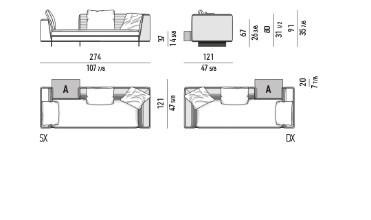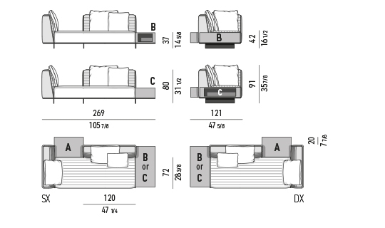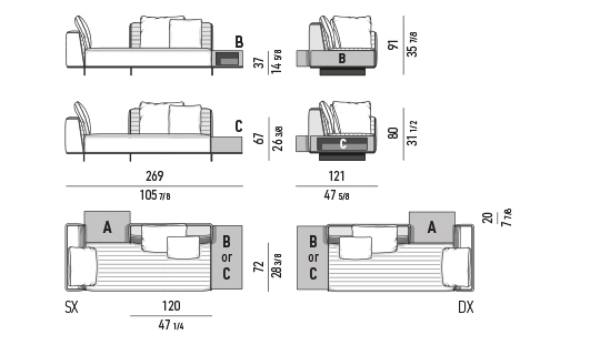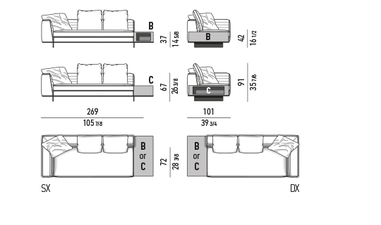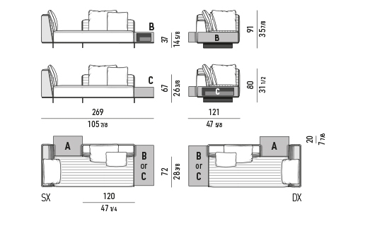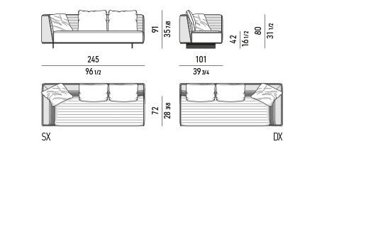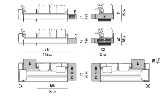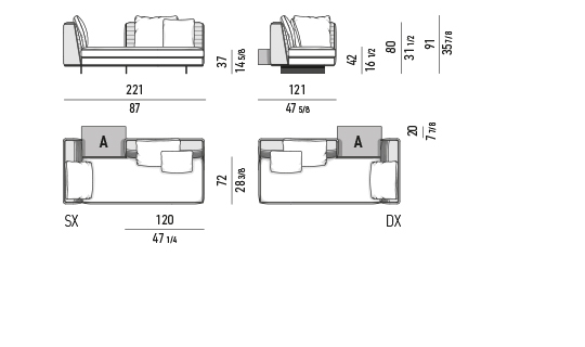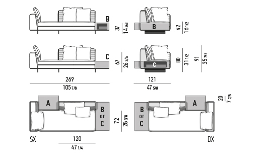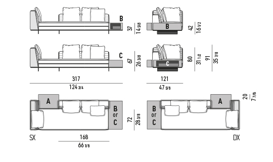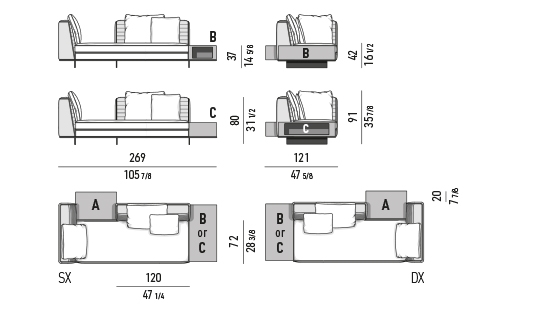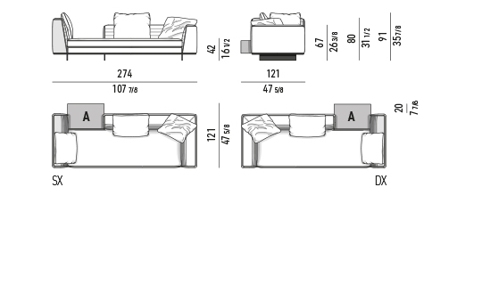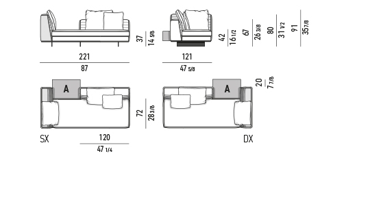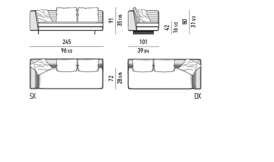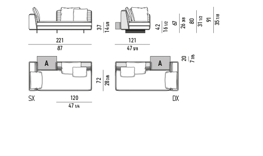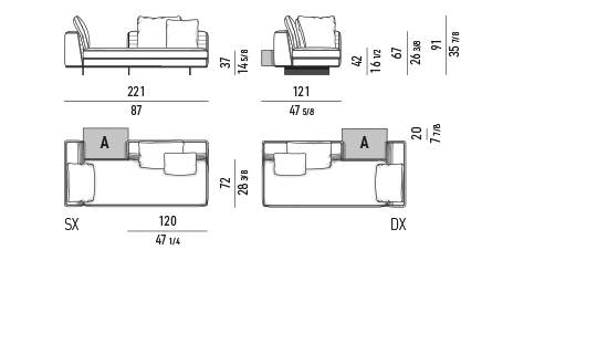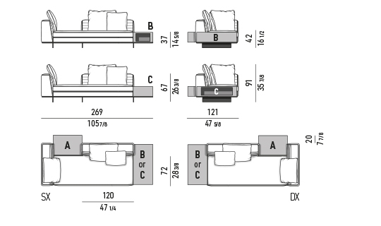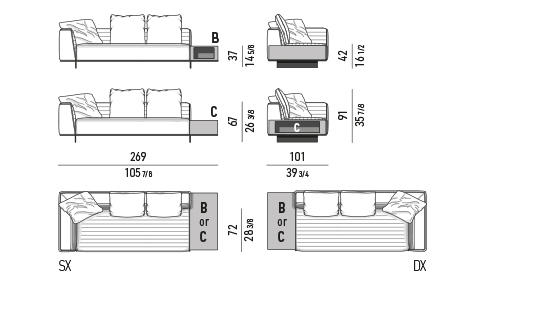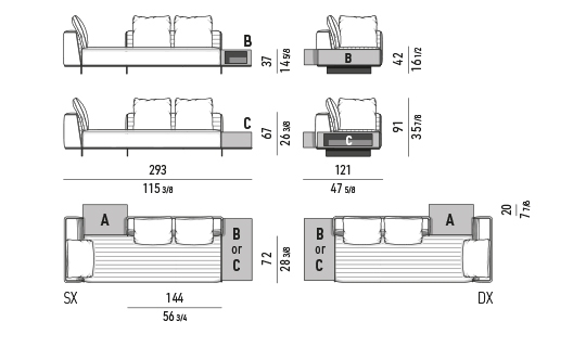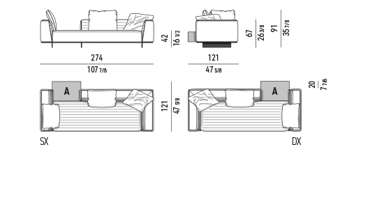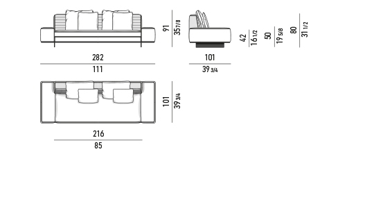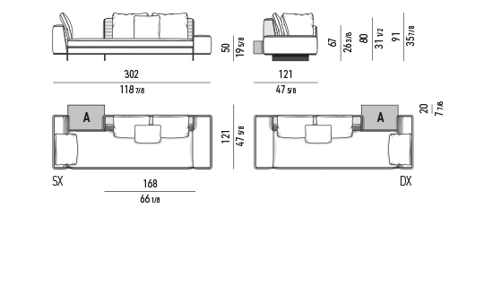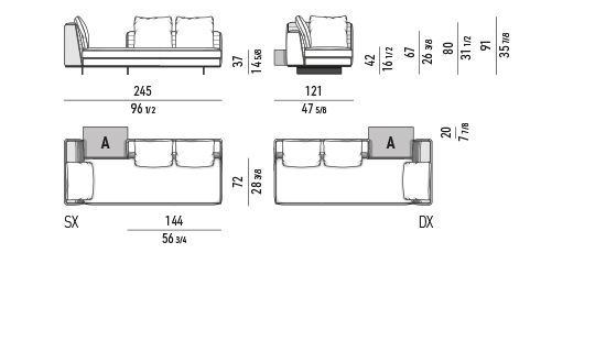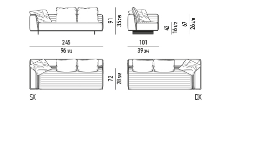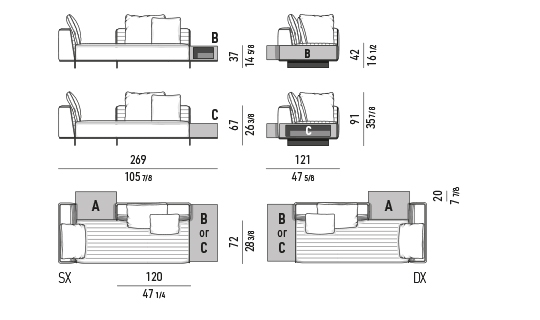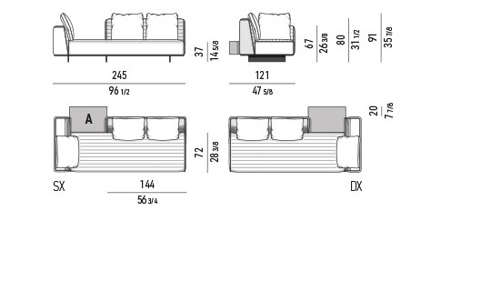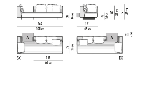 El sistema incluye tres tipos de elementos: Roger Suite, con un cojín como asiento y una profundidad de 101 cm; Roger Spring, un asiento de una sola pieza de la misma profundidad, con un relleno interno de muelles ensacados que garantiza la indeformabilidad del asiento, completamente acolchado en la superficie; por último, el sofá Roger Spring con una profundidad reducida a 94 cm y sin reposabrazos. Los elementos pueden diseñarse libremente con respaldos altos y bajos, diferentes tipos de reposabrazos y la posibilidad de introducir elementos de apoyo y almacenamiento, en voladizo en el respaldo o en posición final, junto al asiento. Un sistema, o más bien un supersistema, capaz de un número exponencial de interpretaciones y configuraciones, tanto en el sector residencial como en el de la hostelería.