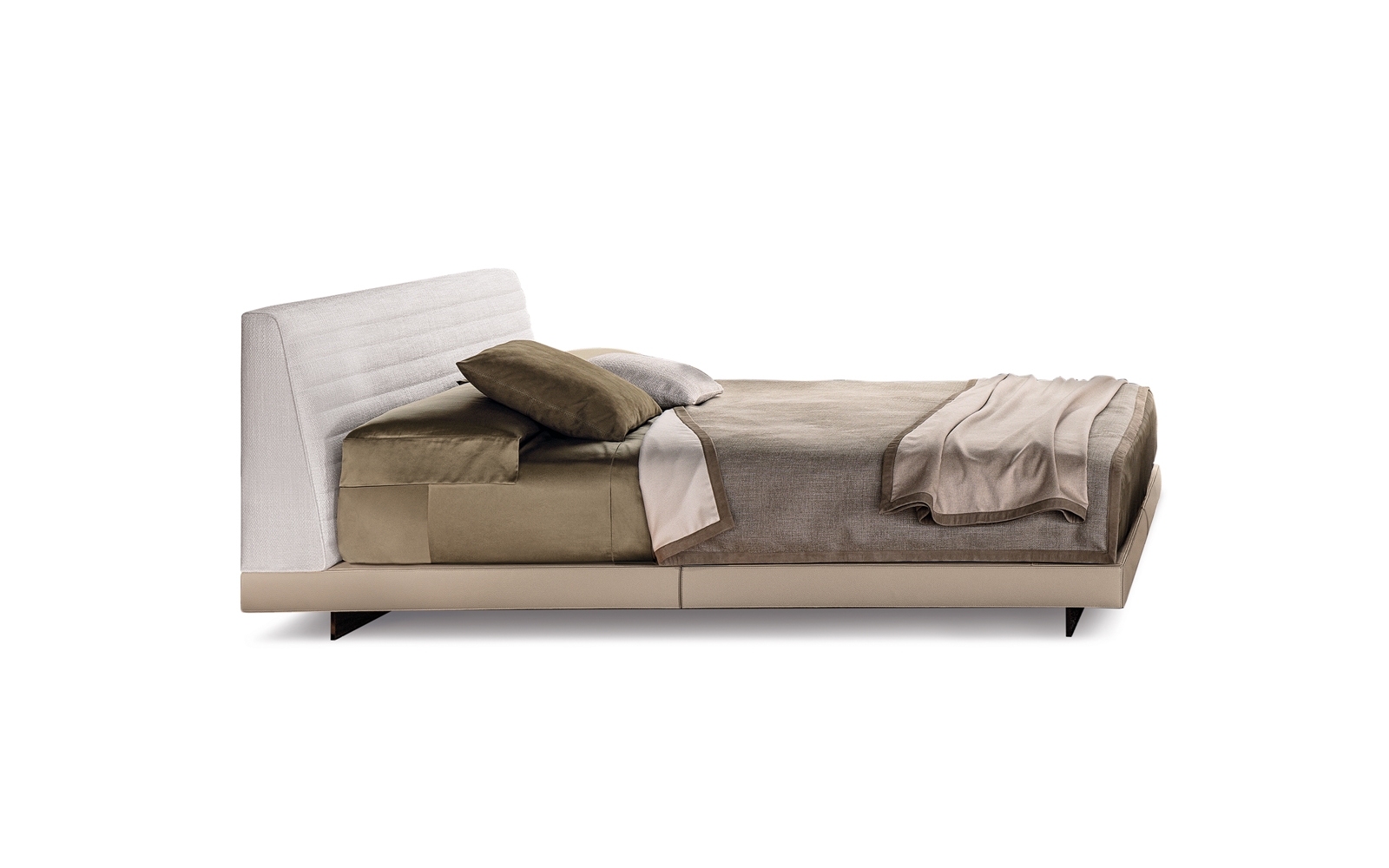 One-piece free-standing bed frame in very thick plywood. The bed frame is designed to accommodate pocket springs covered with a surface layer of high-resilience (CF-free) polyurethane foam. A perforated plywood panel, placed under the springs, facilitates air circulation. An additional perforated technical fabric covering on the upper part of the bed frame allows greater circulation of air throughout the spring structure. Headboard in plywood, padded with high-resilience, variable-density polyurethane foam. Bed frame and headboard are then covered with heat-bonded fibre laminated to white cotton fabric that lends a soft fluffiness to the padding while isolating it from the fabric, ensuring the product is hygienic. The headboard is tailored with a linear embroidery quilted motif that laminates the thick heat-bonded fibre and the white cotton fabric to the upholstery with a longitudinal pattern. Upholstery is available in all-fabric or all-leather or with the bed frame in leather and the headboard in fabric. When the bed frame is upholstered in leather, it is always made with strips of leather, using the same techniques as those for fine luggage, and features hand-finished stitching.