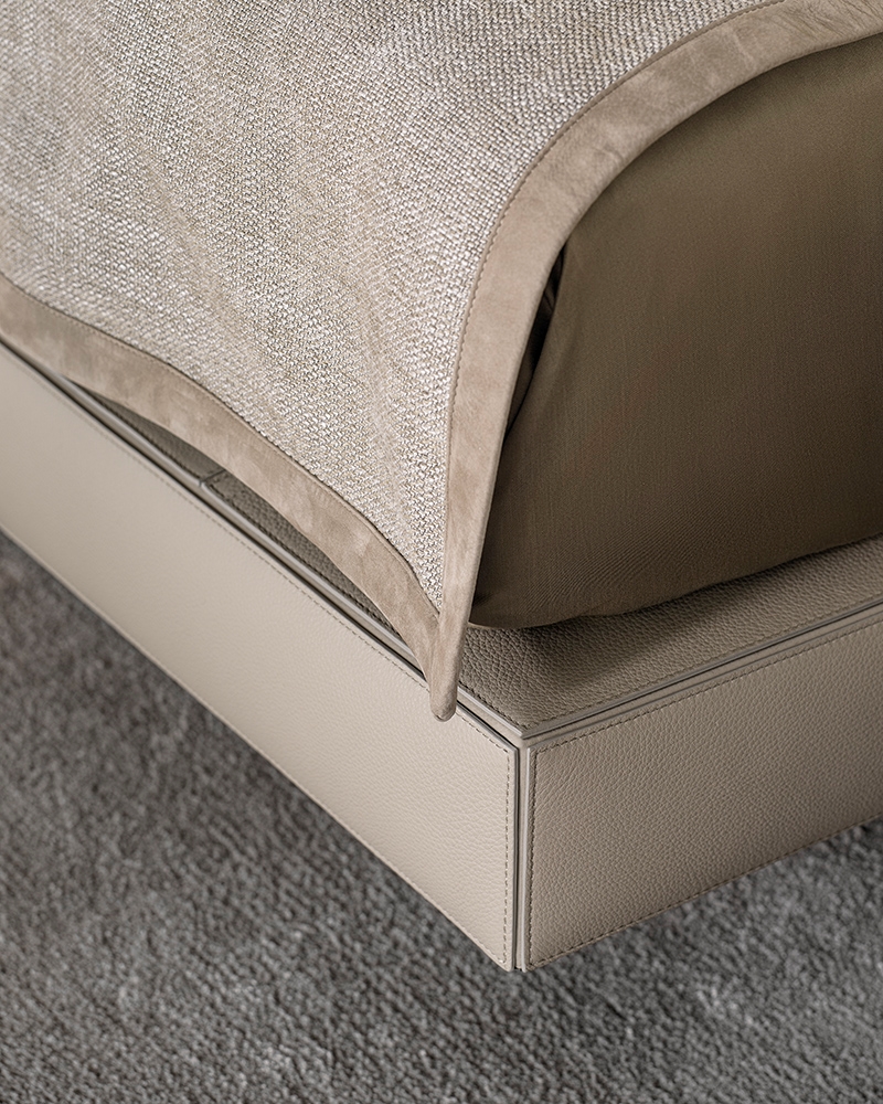 El sutil somier de plataforma suspendida tiene un corte sartorial y está tapizado en tela o cuero y enriquecido con una sofisticada manufactura y costuras de satén: las tiras de cuero de la base estructural están cosidas entre ellas mediante ribetes y trabajadas con la misma técnica que se utiliza para las maletas más sofisticadas.