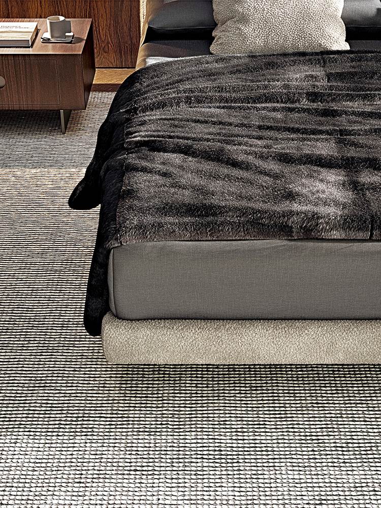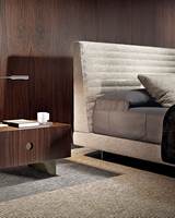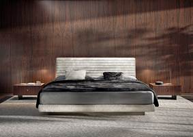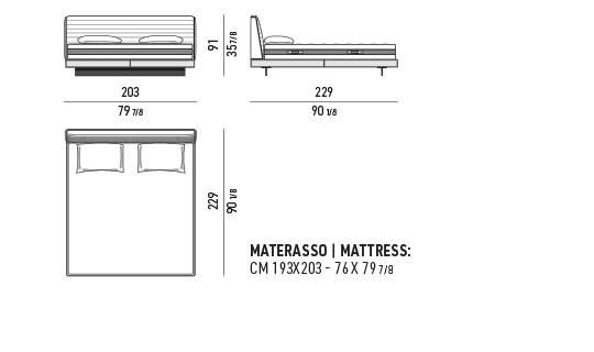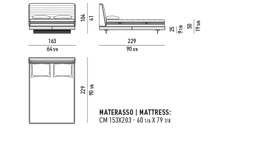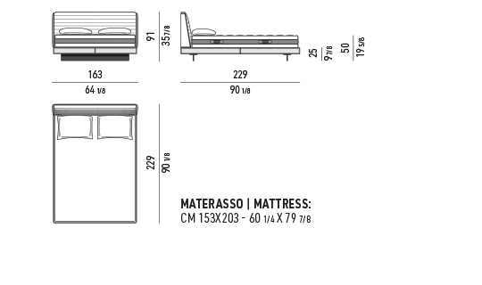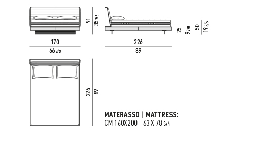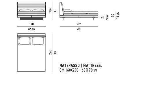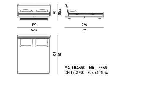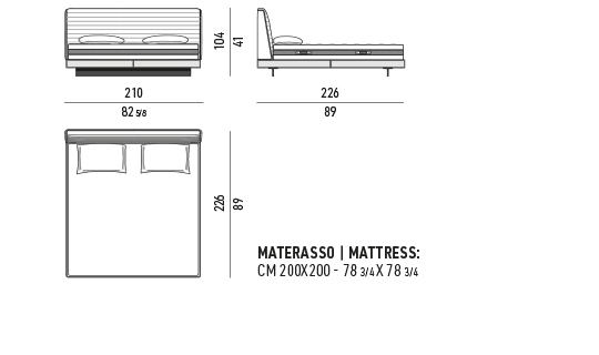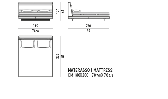 La cama, que también está disponible en una versión con somier de cuero y cabecero de tela, ofrece una comodidad absoluta, gracias también a la inclinación diagonal del cabecero, que recuerda a la del sistema de asientos Roger y proporciona una correcta postura de lectura. Levantada 13 cm del suelo, descansa sobre unas láminas de soporte de aluminio extruido pintadas en color Black Coffee brillante, retranqueadas del perímetro de la cama.