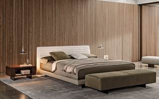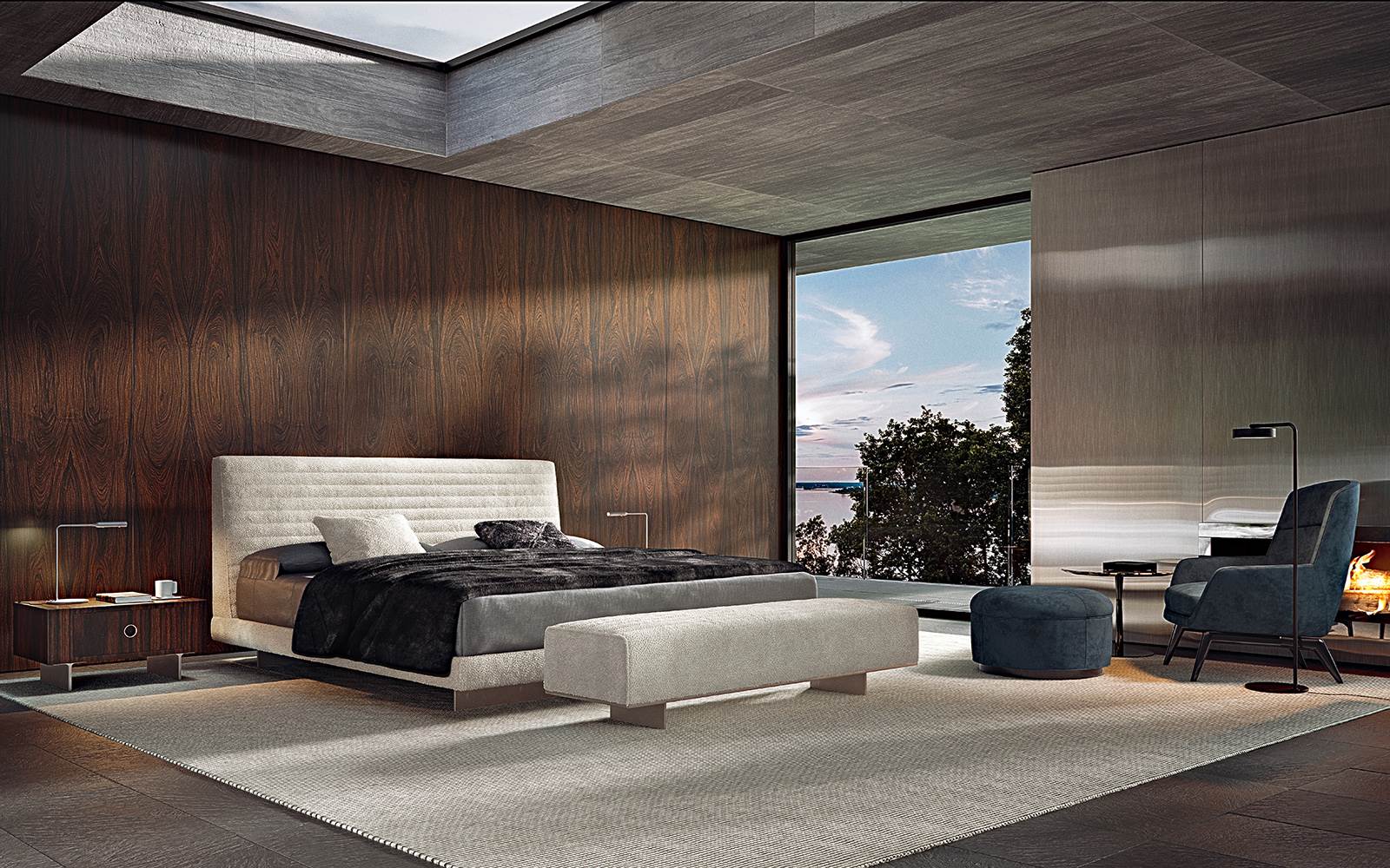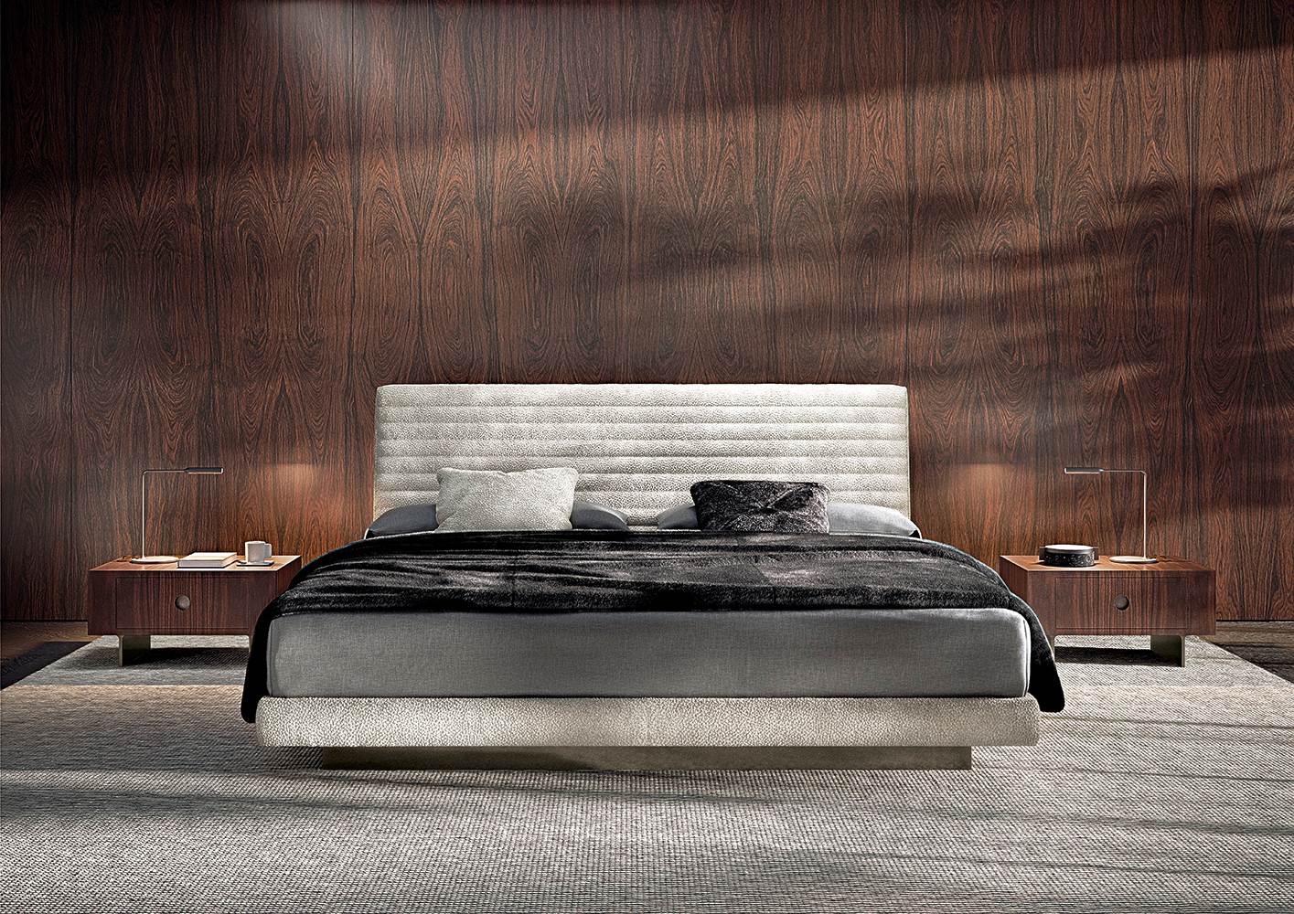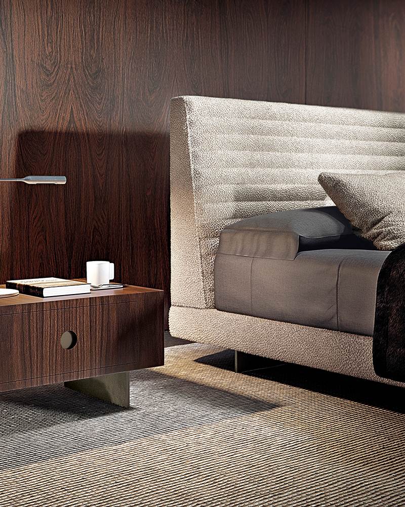 De líneas esenciales y formas esbeltas, la cama Roger retoma el concepto del sistema de asientos del mismo nombre tanto en el efecto aéreo como en la estética de alta costura del cabecero, acolchado con sofisticadas costuras horizontales y ribeteado en todo su perímetro. Su carácter transversal permite tapizarlo con todos los tejidos y pieles de la exclusiva colección Minotti y colocarlo en entornos de descanso pertenecientes a diferentes áreas de muy diversos gustos.