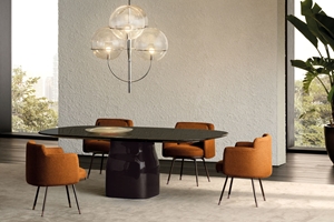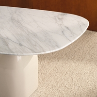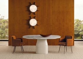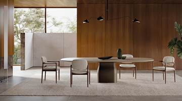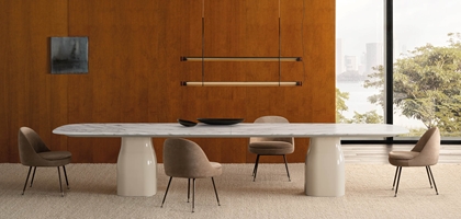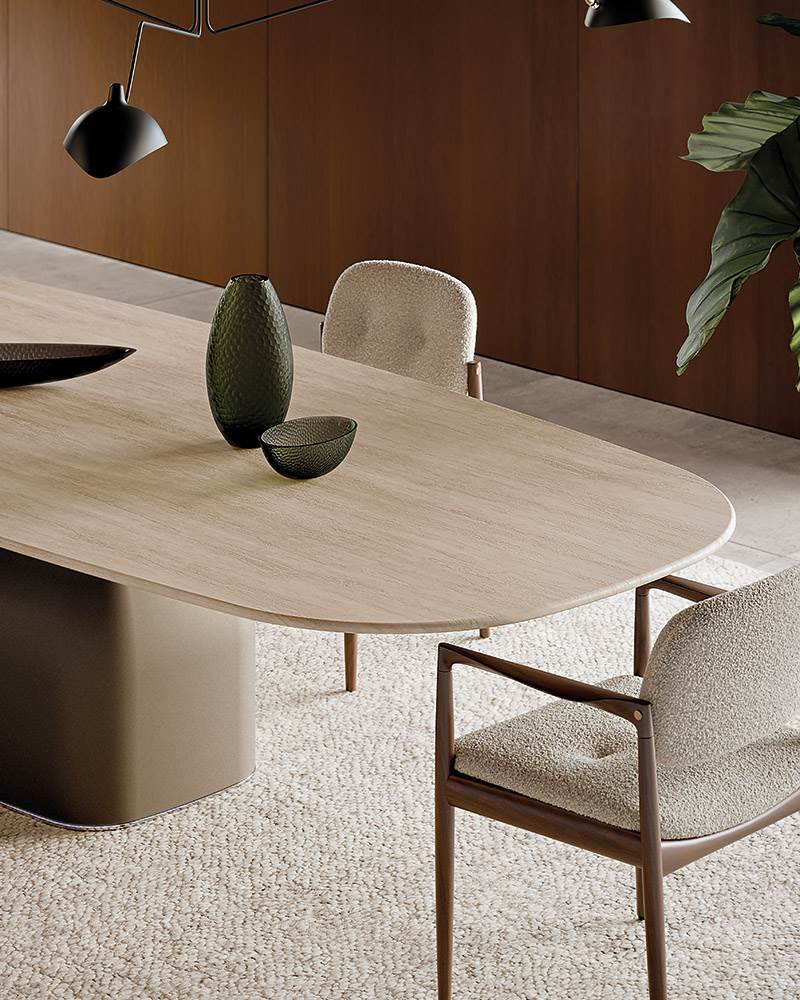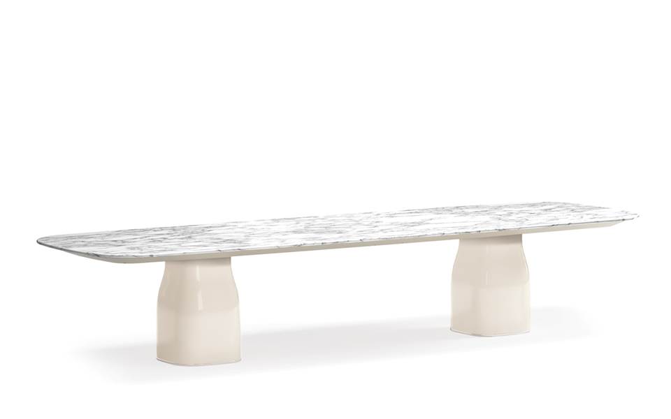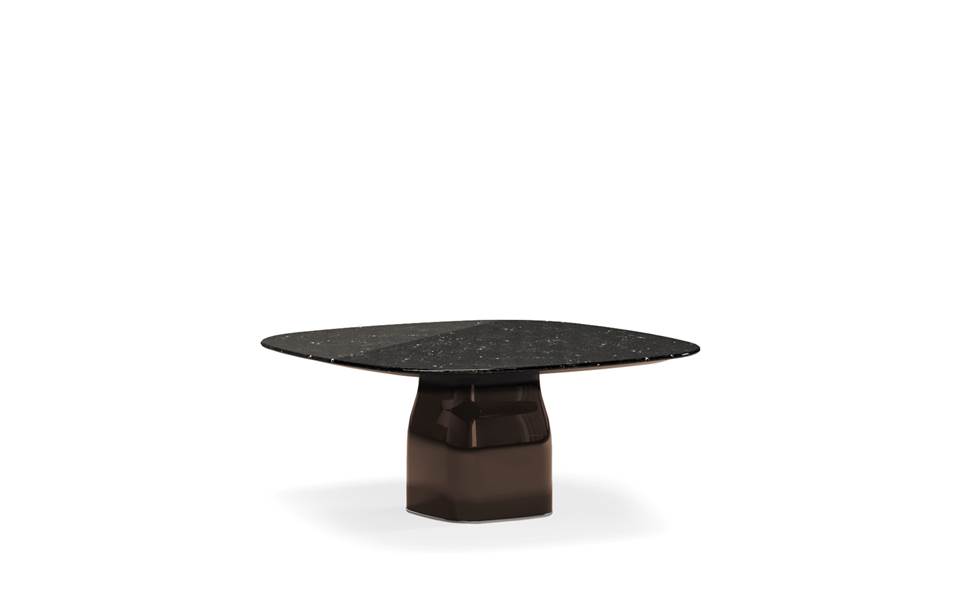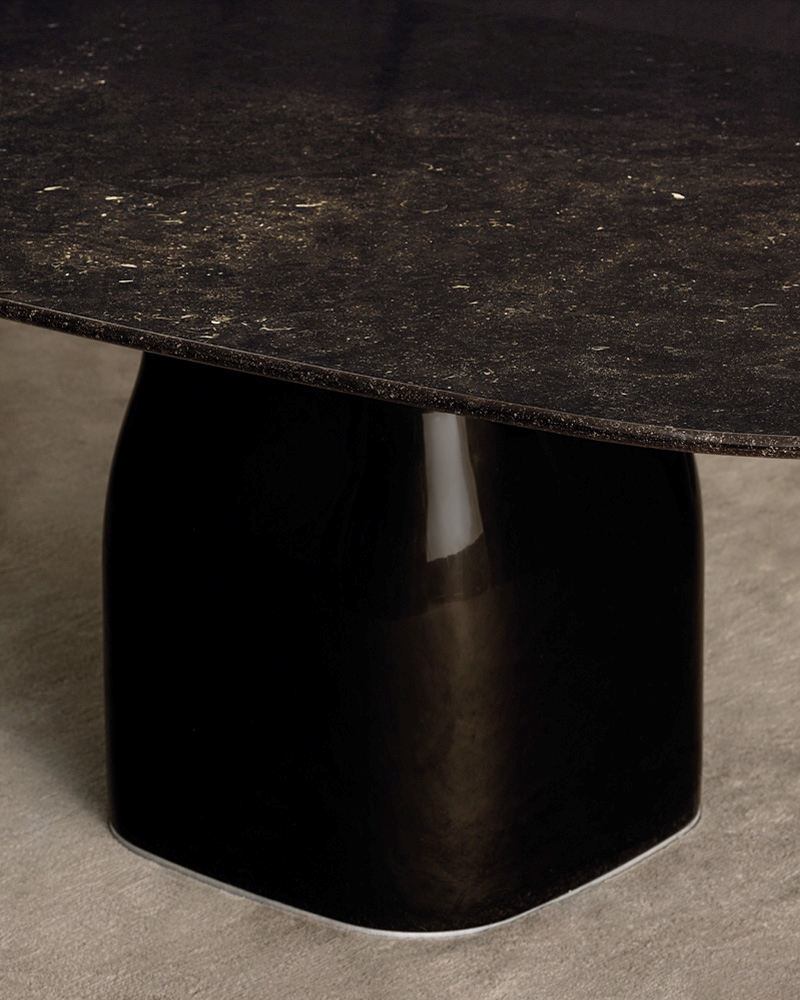 La base escultural de esta mesa la convierte en un objeto con una fuerte identidad, fácilmente rastreable hasta el sinuoso diseño de la familia de asientos Saki.