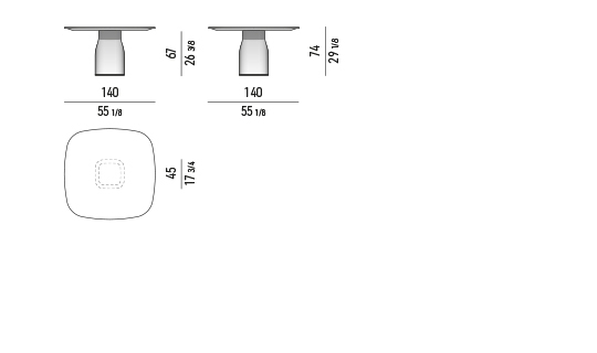 El tablero cuadrado y rectangular con perímetro y esquinas redondeadas está disponible en varios tamaños, en voladizo y ribeteado con un doble canto redondeado, que acentúa su tridimensionalidad en el espacio.