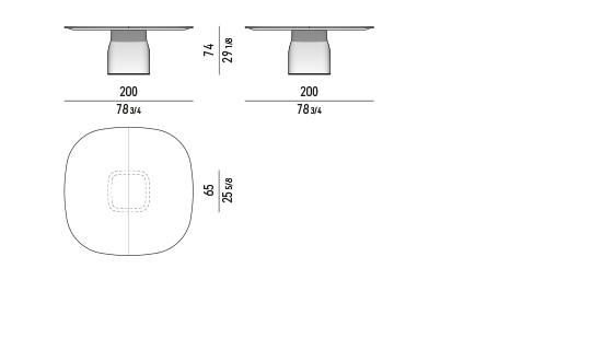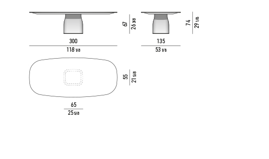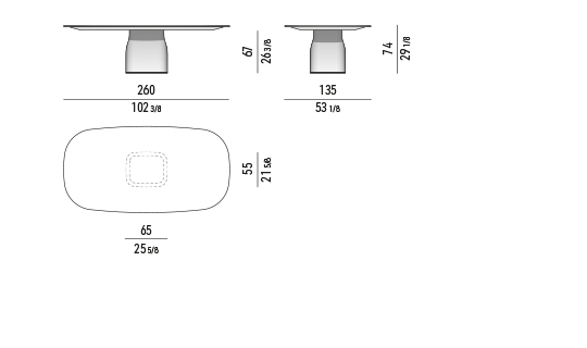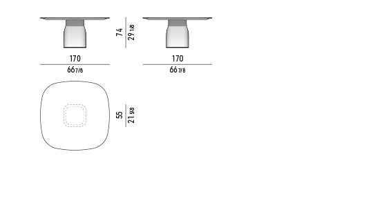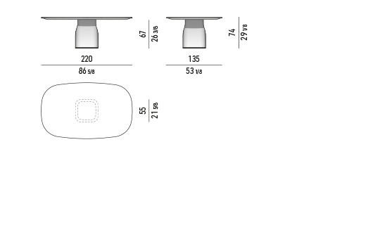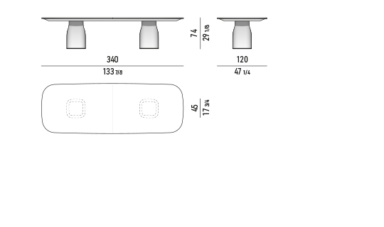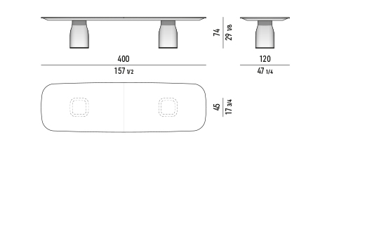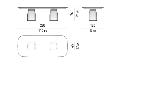 También disponible en la versión rectangular grande, tiene una pata de apoyo doble, colocada en correspondencia con los puntos focales del tablero.